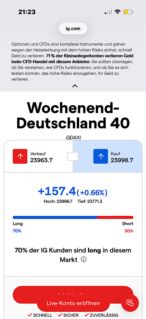 Ganz so schlimm wird es aber morgen nicht werden, denn Romeo hat ja schon die 22300 ausgerufen und dieses Orakel liegt in 9 von 10 Vorhersagen, die er mit den Wochenendtaxen von IG macht, falsch.