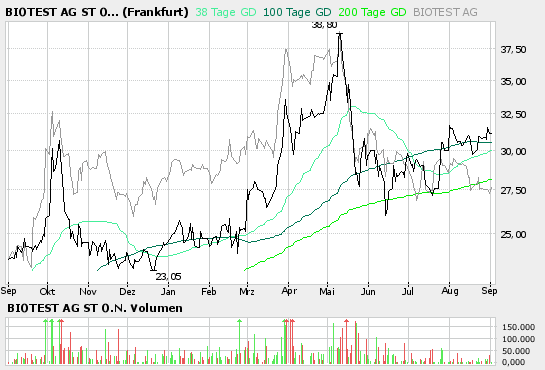 Mitte August legte der Blutplasmaspezialist überzeugende Zahlen vor. Biotest erwirtschaftete im ersten Halbjahr 2006 einen Umsatz von 137,2 Mio. Euro ein Plus von 19,1% im Vergleich zum selben Zeitraum des vergangenen Jahres. Trotz hoher Aufwendungen für Forschung und Entwicklung (F & E) lag der Gewinn vor Steuern und Zinsen mit 14,3 Millionen Euro um 27% höher als das Ergebnis des gleichen Vorjahreszeitraums.