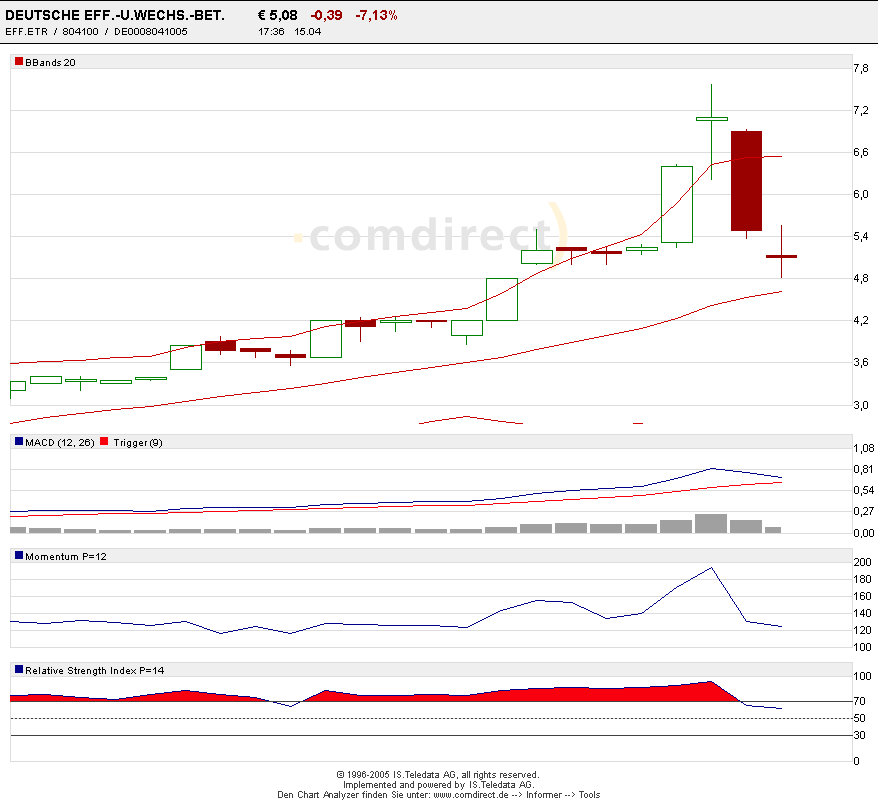 Bei 15 Milionen Aktien + 5 € macht 75 Milionen Euro, d.h. die Aktie ist bei 5 Euro unterbewertete außerdem kommt noch die Chance der Abfindung hinzu. Ich überlege mir den Wiedereinstieg am Mo oder so mal schaun