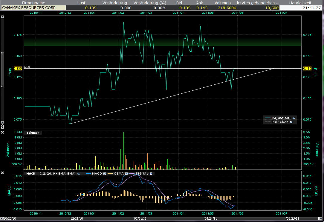 24. Mai 2011 – Canamex Resources Corp. (CSQ: TSX-V) freut sich, den Beginn des für 2011 geplanten Explorationsprogramms auf dem Gold-Silber-Projekt Bruner im County Nye in Nevada bekannt zu geben. Das Unternehmen hat 21 weitere Bergbau-Claims in der nördlichen Randzone des Konzessionsgebiets Bruner abgesteckt. Auf diesen neuen Claims finden sich in Bodenanomalien eingebettete Goldvorkommen, die von Newmont während der Explorationsarbeiten im Umkreis des Konzessionsgebiets in den späten 1980er Jahren entdeckt wurden.