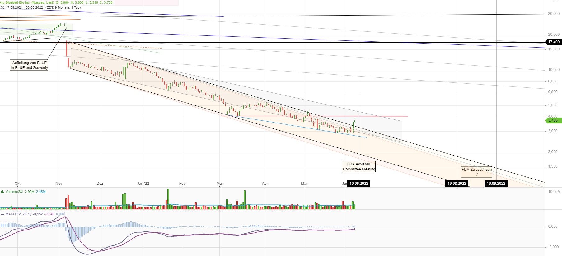 Jetzt stellt sich mir wieder die Frage, ob sich der aktuelle Kurs für einen kurzfristigen Trade lohnen könnte? Das Panel ist in einem Monat, es wäre eine "Wette auf einen Panel Run-Up" oder auf einen positiven Ausgang des Panels. Sollte die Panel negativ ausfallen gehts natürlich weiter bergab und BLUE wäre m.M.n. komplett erledigt.