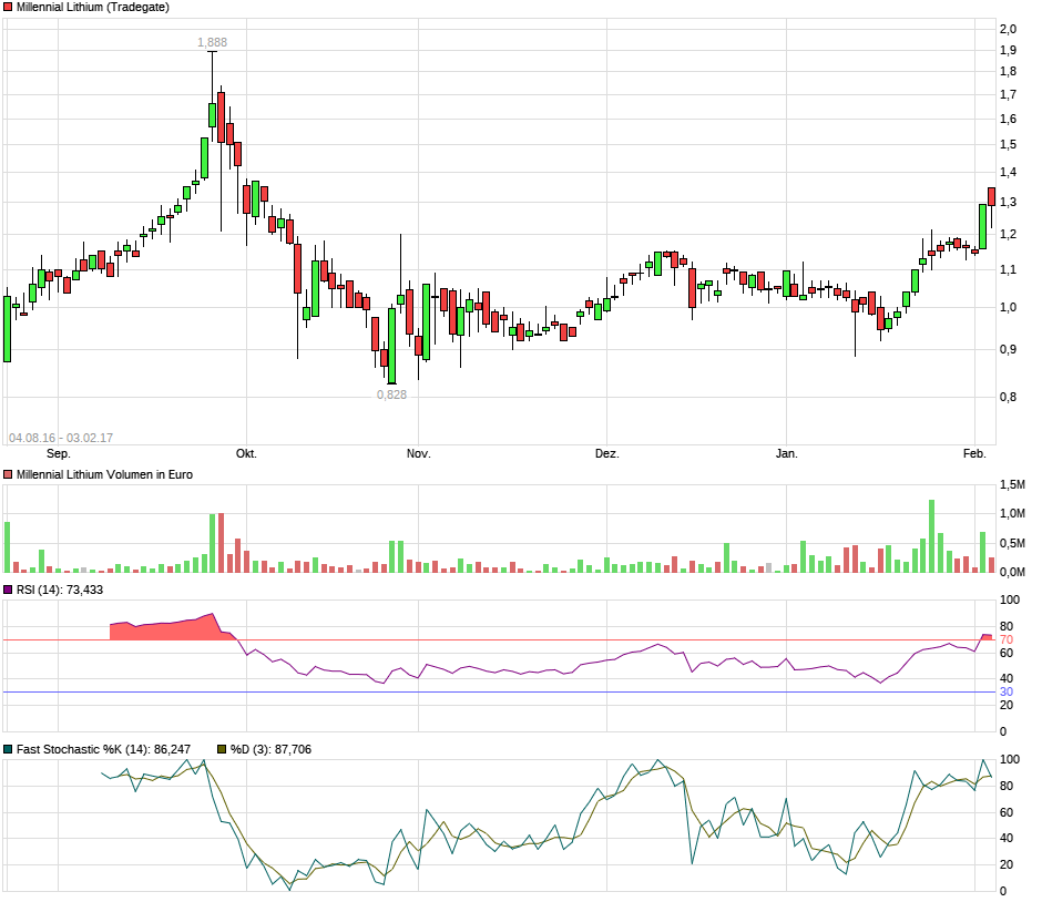 Millennial Lithium ist grade dabei, einige Fördergebiete zu erforschen, hat aber bislang nichts als Optionen auf Förderrechte. Nicht einmal Förder-Genehmigungen! Vom Geld einnehmen (vom verdienen wollen wir ja mal besser gar nicht sprechen!) ist sie noch mindestens 2 Jahre entfernt. Über die Finanzierung der Förderungen ist nichts bekannt. Die Aktie stieg aber steil bis über 1 Euro.