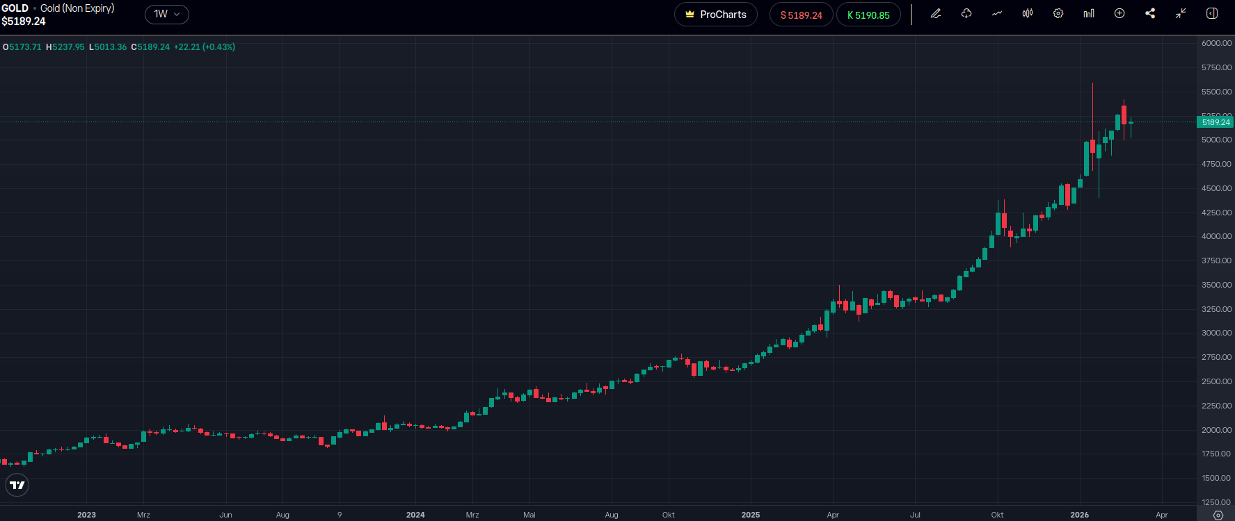 Die Eskalation im Nahen Osten sorgt am Montag für deutlich steigende Goldpreise. Zur Stunde handelt das gelbe Edelmetall über +2% höher bei knapp 5.400 US$ je Feinunze. Doch kann es für Gold aufgrund der geopolitischen Spannungen jetzt vielleicht sogar noch viel höher gehen?