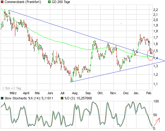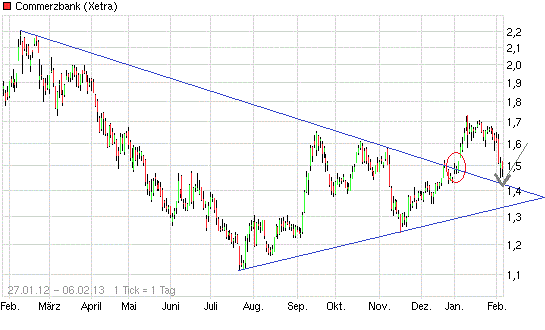29.01.2013 (www.4investors.de) - Dass eine sonst sehr schwankungsfreudige Aktie wie die Commerzbank-Anteilsscheine eine Handelsspanne von nur rund 2 Cent an einem Tag aufweisen, ist sehr ungewöhnlich. Gestern kam es mit Kursen zwischen 1,655 Euro und 1,673 Euro genau zu einer solchen Situation bei der Commerzbank-Aktie, die sich damit unmittelbar zu Beginn der Quartalszahlensaison weiterhin in einer entscheidenden charttechnischen Lage befindet. Fundamentale Nachrichten wie die Zahlen des Kreditinstituts zum Jahr 2012 oder über die geplanten Umstrukturierungen und Kostensenkungen werden auf den Kurs großen Einfluss haben – auch deshalb zeigt sich derzeit am Markt Zurückhaltung bei dem Papier.