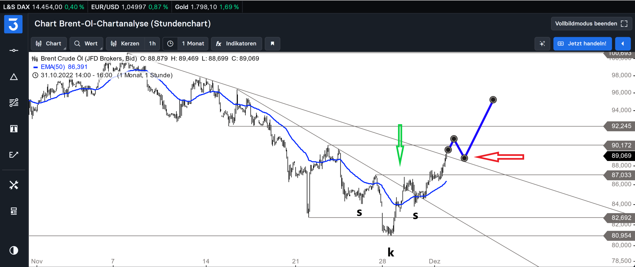Nach vollständigem Abschluß des Umkehrsignales, und kreuzen des EMA 50 wurde die Oberseite des Abwärtstrend bullisch durchkreuzt. (roter Pfeil)
