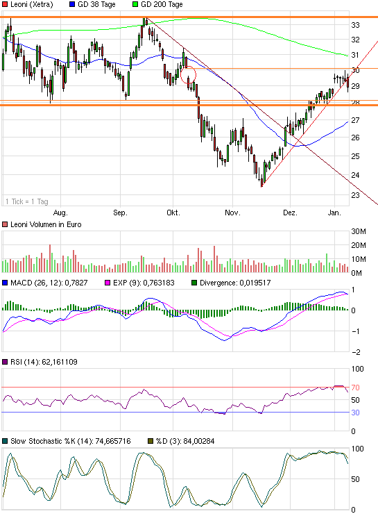 Ich halte Leoni aber grundsätzlich auch für eine interessante Aktie, aber der Vorstand muss natürlich seine Hausaufgaben erst machen. Man ist ja gerade dabei, wenn man sich die News zu Studer oder Korea anschaut. Es gibt Probleme, die zu Sonderbelastungen führen und die man erst lösen muss. Wenns nicht gelingt, hat Leoni in einer rezession besondere Probleme. Wenns gelingt, kann man sich durch den Wegfall der negativen Sonderfaktoren vielleicht sogar erfolgreich gegen einen Rezession stemmen und der Kurs leidet bei einer Börsenbaisse nicht so stark wie andere Werte aus der Branche. Aktuell siehts ja eh erstmal nach steigenden Kursen aus. Aber Leoni hat natürlich das Problem, dass man fundamental selbst von einem schlechten Q4 mit stark fallenden Gewinnen spricht, und charttechnisch bei 28,0-28,5 € vor einem starken Widerstand steht. Das hemmt den Kurs derzeit psychologisch. |