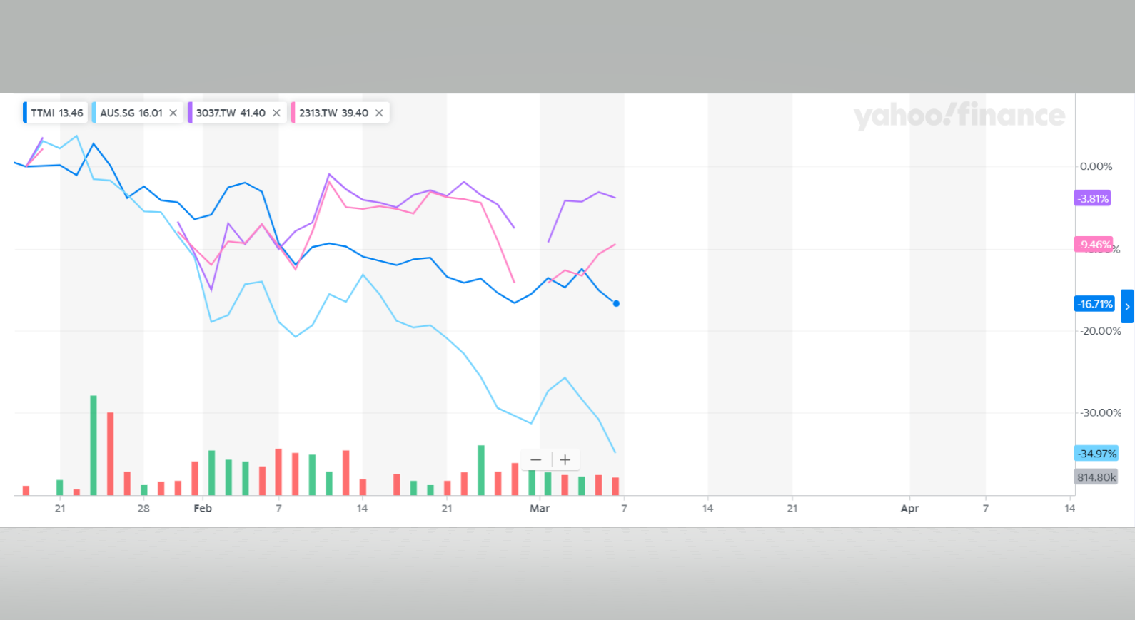 Seit Corona in den Medien gelandet ist, hat AT&S 35% an Wert verloren, während der wichtige Mitbewerb zwischen 4 und 17% verloren hat.