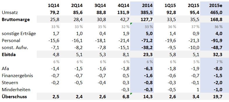 Zu beachten ist ebenfalls, dass die Österreicher im Segment Appliances Smart Energy über die Mehrheitsbeteiligung an NES Verluste zu tragen haben. NES wird 2015 knapp 40 Mio. Dollar umsetzen und den Gewinn um bis 2.5 Mio. Dollar drücken. Wir haben diesen Effekt bei unserer Gewinnprognose von 15 Mio. Euro berücksichtigt. Abzuziehen sind noch Minderheitsanteile, die sich auf gut 1 Mio. Euro belaufen werden. Unterm Strich wird S&T sodann ca. 14 Mio. Euro verdienen oder 33 Cent je Aktie. Die EBITDA-Marge schätzen wir auf 5.5% oder das EBITDA auf 25 bis 26 Mio. Euro.