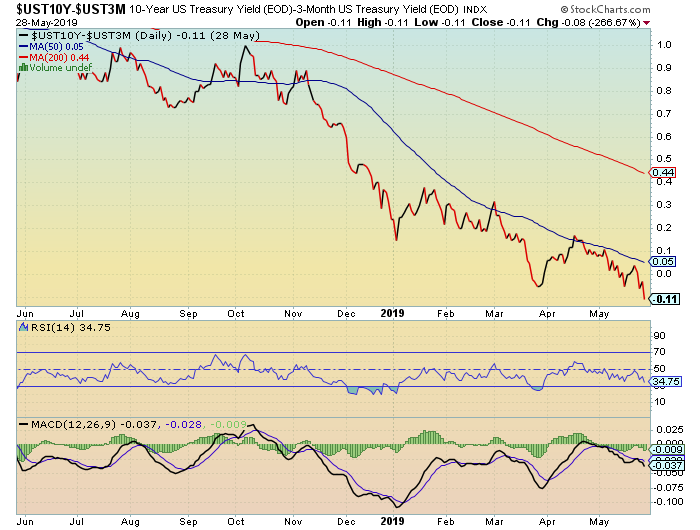 Aber auf der Rendite-Seite hat sich mittlerweile grundlegendes geändert. Der Spread zwischen den zehnjährigen TNotes und den 13-wöchigen TBills ist Anfang Dezember 2018 unter den Warnpegel von 0,5% gesunken und hat Ende März, sowie aktuell wieder die Nulllinie erreicht. Dieser Spread am kurzen Ende der Zinsstruktur ist insofern von besonderer Bedeutung, als ein niedriger Spread das Standard-Geschäft der Banken tangiert. Ein niedriger Spread macht die Refinanzierung von Krediten weniger attraktiv, weshalb die Bereitschaft abnimmt, Kredite zu vergeben. Ein ungünstiges Zeichen in unserer Kredit-getriebenen Wirtschaft