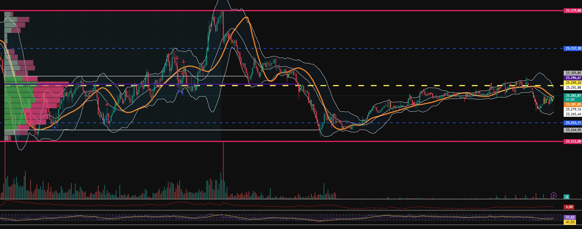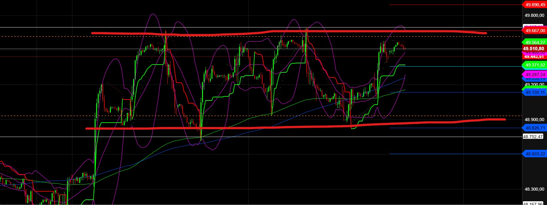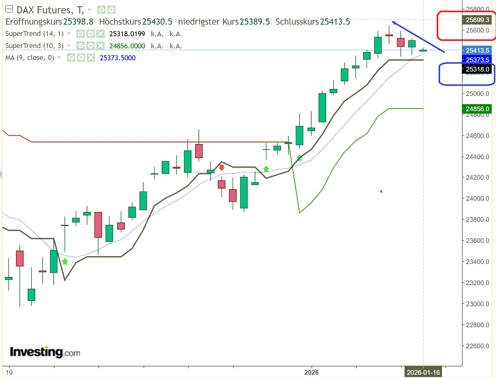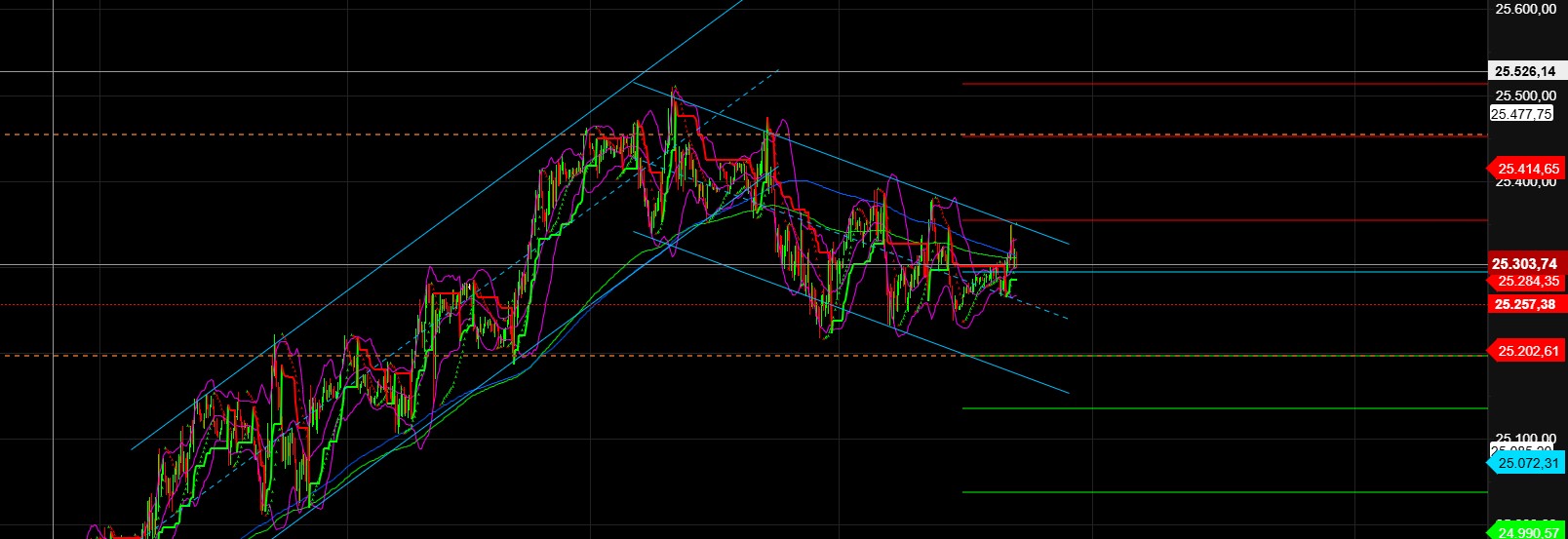 Die Pullbackstrecke ist normalerweise noch nicht beendet und hat das Ziel 24.850 bis 20.1.26. Der XETRA DAX hat einen ersten Pullbackabschnitt beendet und befand sich gestern Nachmittag in einem Zwischenanstieg. Ab 25.400 dürfte ein zwei Pullbackabschnitt starten, zu 25.233 und 25.120 bis 20.1. im Idealfall auch zu 24.890/24.850. Sollten die Marktteilnehmer zu gierig sein, dann könnten sie den DAX heute zwar bis 25.510 und 25.550 anheben, doch wäre dann schon wieder Schluss, da der Kanal den DAX-Fortschritt momentan bei 25.550 noch eindämmt. Daher lieber noch ein bisschen den DAX seitwärts laufen lassen. Je länger die Seitwärtsphase, desto größer das spätere Anstiegspotenzial.