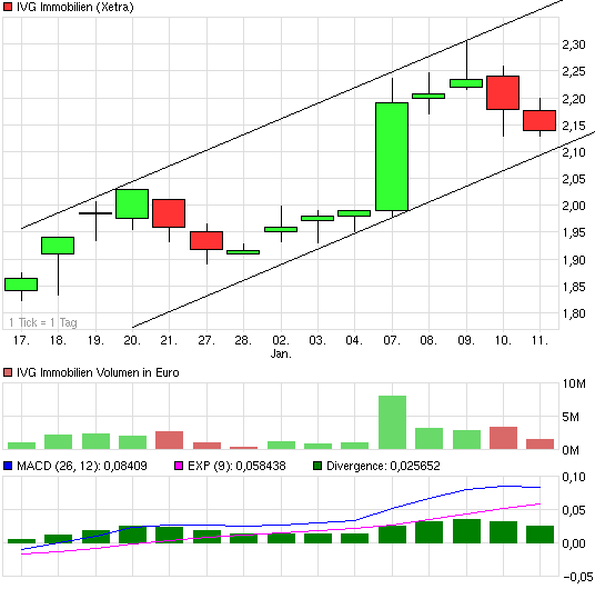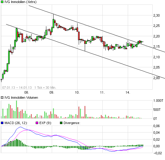 IVG Immobilien - Massive Rally könnte starten | 07.01.2013, 13:40 | 718 Aufrufe | 0 | IVG Immobilien - WKN: 620570 - ISIN: DE0006205701 Börse: Xetra in Euro / Kursstand: 2,144 Euro Die IVG Immobilien Aktie versucht heute den Ausbruch aus der mehrwöchigen Seitwärtsrange und damit auch einen Ausbruch über die 2,11 Euro-Marke sowie den EMA50 (blau). Damit könnten sich nun interessante Longchancen ergeben. Hat dieser Ausbruch letztlich auf Wochenschlussbasis Bestand, wird eine Rally bis 2,63 und 3,20 - 3,30 Euro möglich. Oberhalb davon wäre langfristig Platz bis 5,04 Euro. John Gossen zeigt Ihnen jetzt DAX-Aktien, die 2013 explodieren. Kippt die Aktie jetzt hingegen deutlich nach unten weg und rutscht per Tagesschluss unter 1,89 Euro ab, können Abgaben bis 1,70 - 1,76 Euro folgen. Bei einem Wochenschluss unterhalb von 1,70 Euro entsteht ein Verkaufsignal mit Ziel am Tief bei 1,252 Euro. Kursverlauf vom 10.06.2011 bis 07.01.2013 (log. Kerzendarstellung / 1 Kerze = 1 Tag)