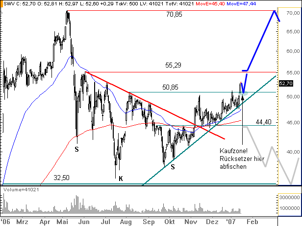 Beim nun beginnenden anstieg der SW-Aktie in Richtung zznächst über die alten 70 euro (Allzeithoch!) vom Mai 2006 wird es Rückschläge geben, auf diesen hohen Niveaus.