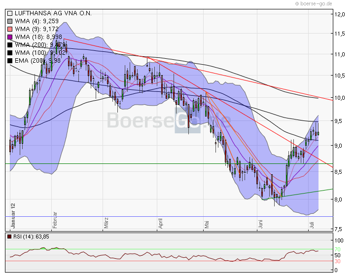 Charttechnisch sieht es für die Lufthansa-Aktie wieder gut aus. Nach dem 52-Wochen-Tief am 12. Juni bei 7,88 Euro konnte sich die Aktie nach oben abstoßen und hat bis heute fast 20 Prozent an Wert zugelegt. Der Widerstand bei neun Euro wurde nach oben durchbrochen. Der mittelfristige Abwärtstrend in der Region um 9,40 Euro ist nun das nächste Ziel, das überwunden werden muss. Der nächste Widerstand liegt bei 10,15 Euro.