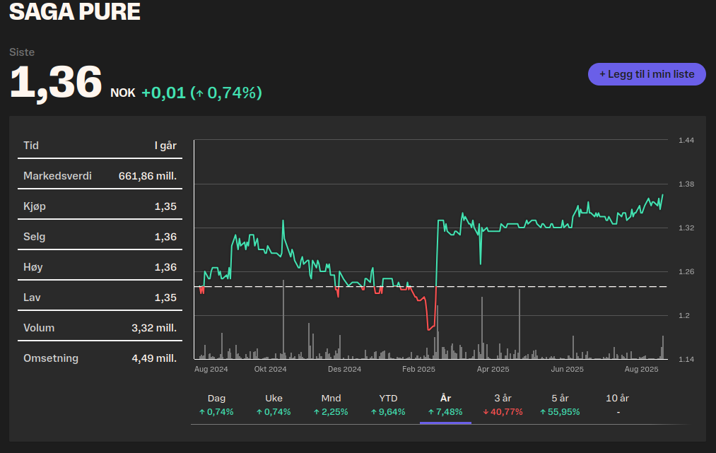 Cash-Bestand („Cash and equivalents”) per 30.6.2025: NOK 187 630 Tsd., also rund NOK 188 Mio. (siehe Quartalsbericht Q2/2025, Seite 7 (Investor relations | Saga Pure)