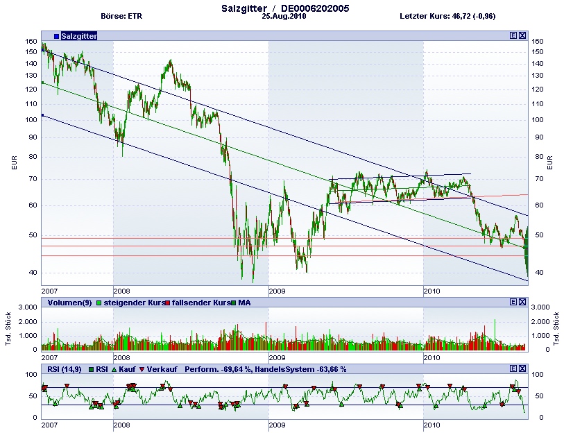 -- also ich kann mir das nicht vorstellen. Der Chart zeigt den Verlauf seit dem Höchststand im Jahr 2007. Es ist eindrucksvoll wie konsistent der Niedergang seitdem ist, wenn man mal zugesteht dass um den Jahreswechsel 2008/09 am Höhepunkt der Finanzkrise eine Sondersituation herrschte. Salzgitter notiert gegenwärtig aber wieder in diesem Bereich! Der Versuch da rauszulaufen ist vor ein paar Monaten brutal gestoppt worden. Aber dem alten Abwärts-Kanal einfach wieder zu folgen und von hier aus an seine untere Begrenzung zu gehen scheint mir viel zu steil; und da ist eine starke Unterstützungszone davor. Ich seh also eigentlich momentan nur ein Durchsacken auf einen bereits etablierten Boden. Meine Erwartung wäre dass die Aktie sich auch aus technischen Gründen am ehesten wieder für den Widerstandsbereich rund um die 60 interessieren wird.