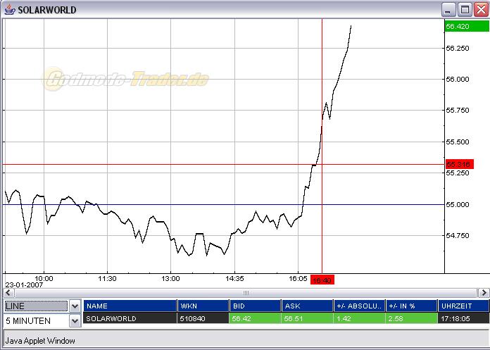 Schließt die Solarworld Aktie heute über 55,30 Euro gibt es charttechnisch keinerlei Widerstand mehr bis rund 70 + darüber hinaus von mir aus bis 150 Euro.