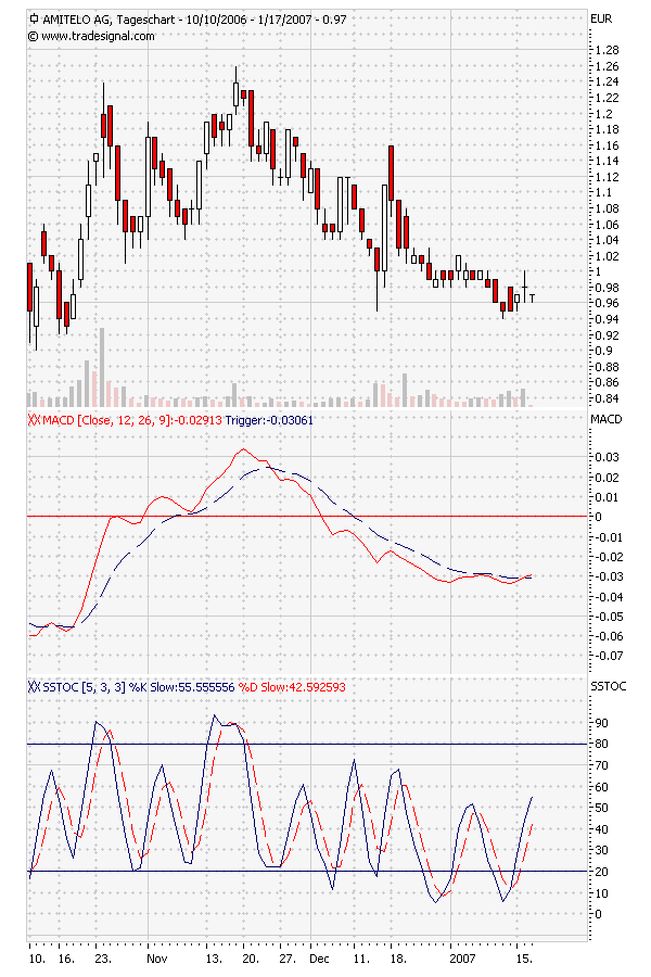 Derzeit ist die Marke von 1,00 Euro eine Art Hemmschwelle. Nach oben geht es nicht wirklich voran, nach unten wirkt sie als Unterstützung. Die Analysten glauben weiterhin, dass Amitelo gerade in diesem Jahr mit hervorragenden Zahlen aufwarten können wird. Unser Stoploss-Kurs für das Musterdepot liegt bei 0,85 Euro. Noch kann man günstig in den Wert einsteigen. Sollte Amitelo zeitnah neue Prognosezahlen für 2007 veröffentlichen, könnte sich so mancher Aktionär ärgern!