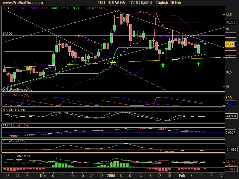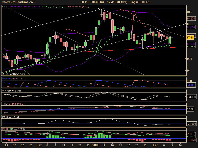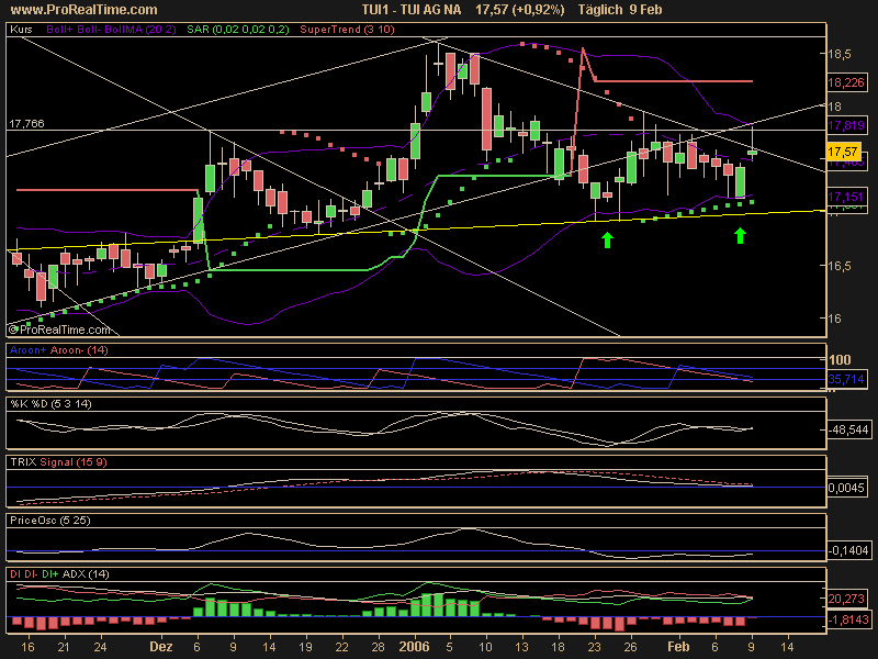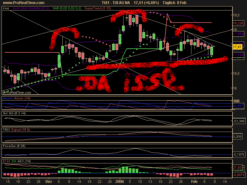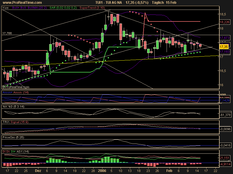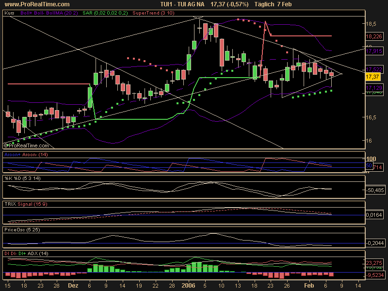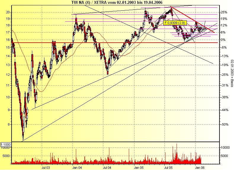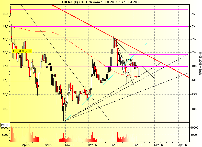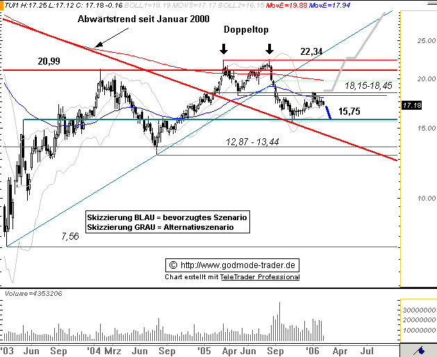 Diagnose: Die TUI Aktie startete im März 2003 nach einem Tief bei 7,56 Euro eine langfristige Aufwärtsbewegung. Nach einem Zwischenhoch im Januar 2004 bei 21,18 Euro, mit dem sie am Widerstand bei 20,99Euro scheiterte, ging die Aktie in eine ausführliche Korrektur über, welche die Aktie bis Juli 2004 auf ein Tief bei 12,87 Euro führte. Danach setzte die Aktie ihre Rallye bis März 2005 fort und durchbrach dabei den langfristigen Abwärtstrend seit Januar 2000. Von dem Hoch aus dem März 2005 bei 22,34 Euro bildete die Aktie eine Topformation aus. Diese vollendete die Aktie Ende August. Im Anschluss daran fiel sie deutlich ab. Im Oktober erreichte sie ein Tief bei 15,60 Euro. Damit testete die Aktie den gebrochenen langfristigen Abwärtstrend. Von dort aus erholte sich die Aktie bis an die Widerstandszone 18,15-18,45 Euro, wo sie Anfang Januar abprallte.