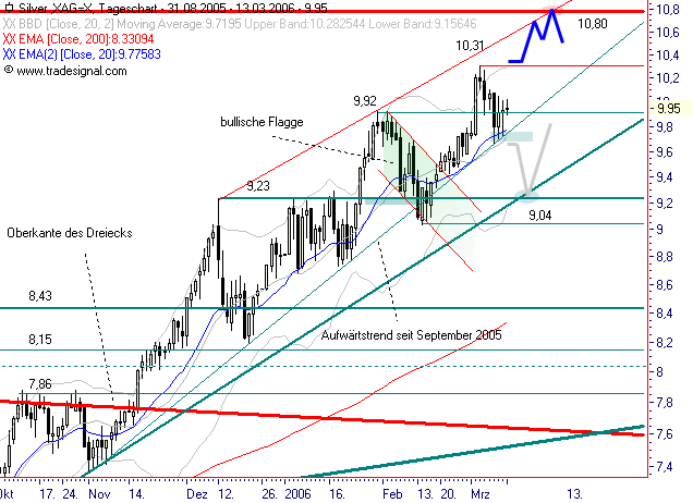 Silber ist heute knapper denn je, da das Edelmetall immer mehr von den boomenden Wachstumsmärkten China und Indien nachgefragt wird. Da die Fundamentaldaten des Silbermarktes gänzlich anders sind als die des Goldmarktes, sollte der Silberpreis bei einer starken Korrektur des Goldpreises sich von der Korrelation zum Gold entkoppeln. Zwar besteht auch für das Silber ein Rückschlagspotential auf etwa 9 US-Dollar, jedoch dürfte eine solche Korrektur, wenn Sie überhaupt stattfindet, nur von kurzer Dauer sein. Silber gewinnt zunehmend nicht nur als Industriemetall und Schmuckbereich zunehmend an Bedeutung, sondern vor allem als Ersatzwährung gegenüber dem kränkelnden US-Dollar.