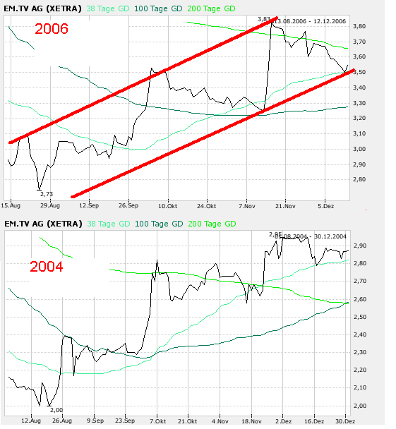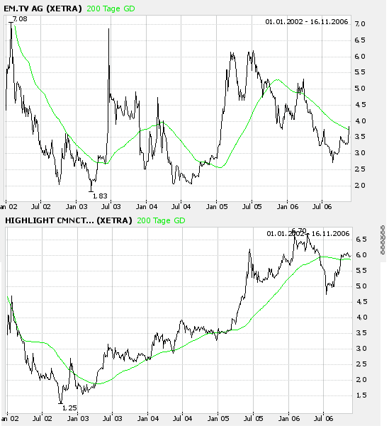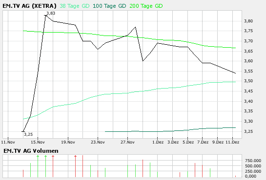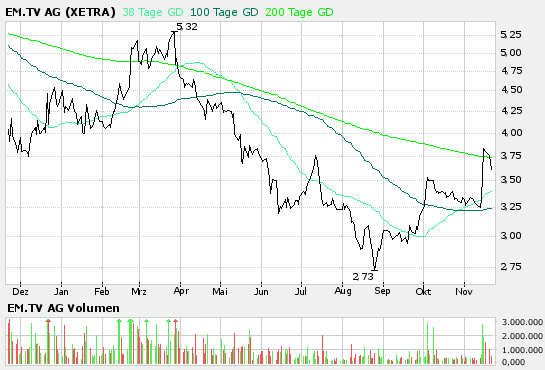 Das Medienunternehmen EM.TV weist für das dritte Quartal und das bisherige Geschäftsjahr ein positives Ergebnis aus. Wie das Unternehmen am heutigen Dienstag mitteilte, stieg der Umsatz gegenüber dem Vorjahresquartal um knapp 25 Prozent auf 57,5 Millionen Euro. Dies sei vor allem auf eine anhaltende Geschäftsbelebung im Segment Sport zurückzuführen. In den ersten neun Monaten des laufenden Fiskaljahres kletterte der Umsatz gegenüber dem Vorjahreszeitraum um 22 Prozent auf 179 Millionen Euro.