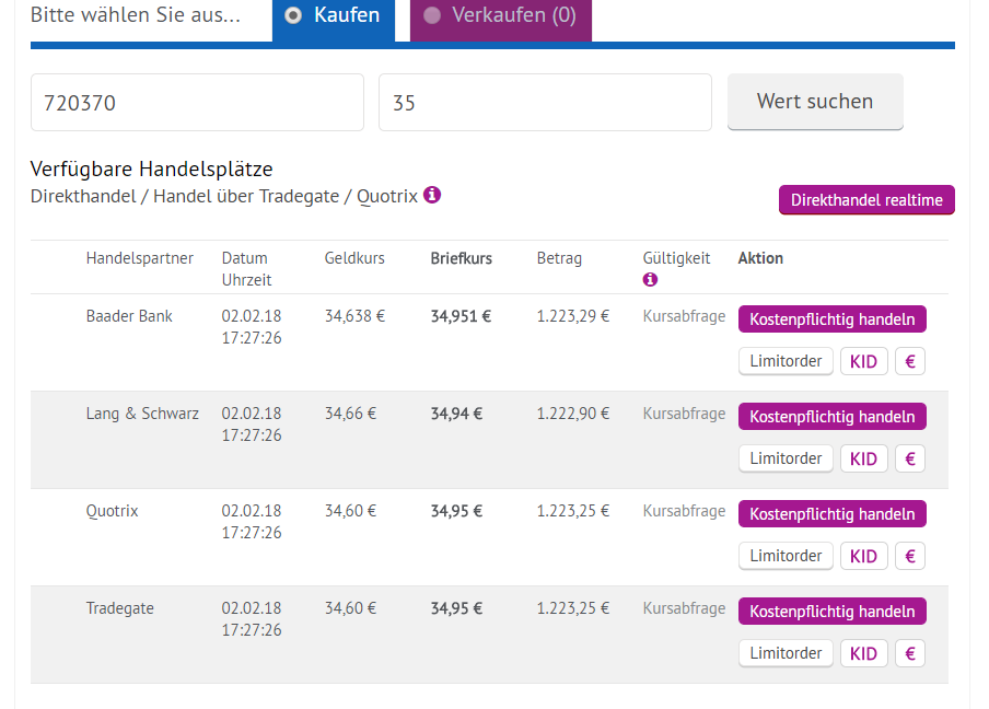 Und Realtime-Kurse bieten neben Tradegate auch Baader Bank, Lang & Schwarz und Quotrix an. Somit aus meiner Sicht auch kein konkreter Vorteil für Tradegate.