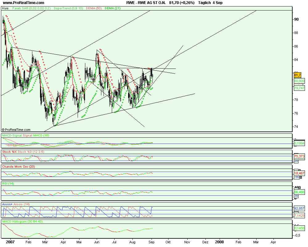 Hab mich mit meiner Kurseinschätzung und dem Nachholpotential wirklich wohl verkalkuliert,mein Optionsschein wird am 12.09. bereits bewertet,zwar ist der Schein im geld,aber der Gewinn wird wohl eher unspektakulär,muß also in einen Schein mit längerer Laufzeit switchen,denn dass RWE um die 20 % zulet in den nächsten Monaten,davon gehe ich weiterhin aus.