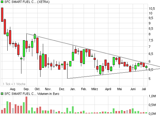 Auch eine Möglichkeit wäre die Charttechnik, wobei ich die eigentlich bei SFC nicht gelten lasse, da die Aktie dafür zu markteng ist. Allerdings hat sich durchaus ein Dreieck ausgebildet gehabt, welches heute nach oben verlassen wurde.