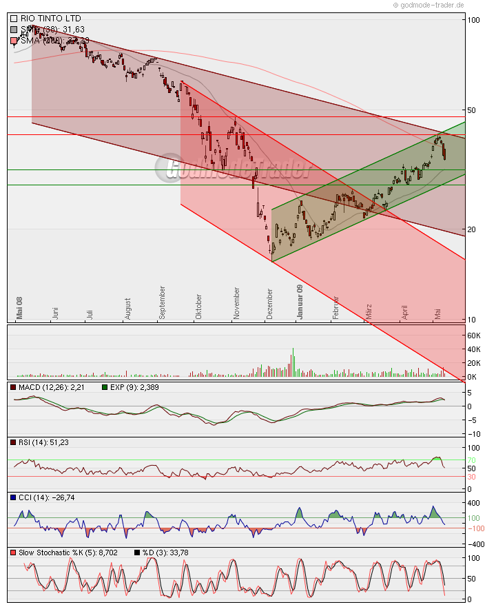 Seit Mai 2008 befindet sich die Aktie in einem Abwärtstrend, welcher sich im September 2008 verstärkte. Dieser sekundäre Abwärtstrend wurde jedoch Anfang Dezember 2008 druchbrochen und mündete in einem tertiäten Aufwärtstrend. Dieser hat auch immer noch bestand, prallte jedoch am Kreuzwiderstand um 41,3 bis 42,6 ab. In diesem Bereich verläuft sowohl die obere Trendlinie des primären Abwärtstrends, als auch ein massiverer Widerstand. Da jedoch evtl. in Kürze der 38-Tage-Durchschnitt den 200-Tage-Durchschnitt kreuzt, könnte ein neues Kaufsignal generiert werden. Während MACD und Volumen dem Trend etwas negativer gegenüber stehten, weisen CCI, RSI und Slow Stochastic jedoch darauf hin, dass der Trend weiterhin intakt ist . Es bleibt somit abzuwarten, ob die Aktie in den nächsten Anläufen den Widerstand durchbrechen kann. In diesem Fall steht einer weiteren Aufwärtsralley vorerst nichts im Wege.