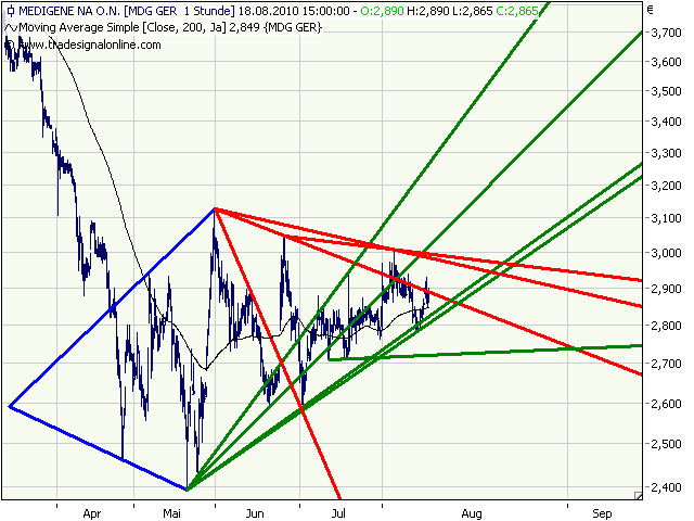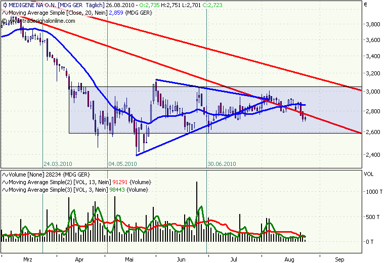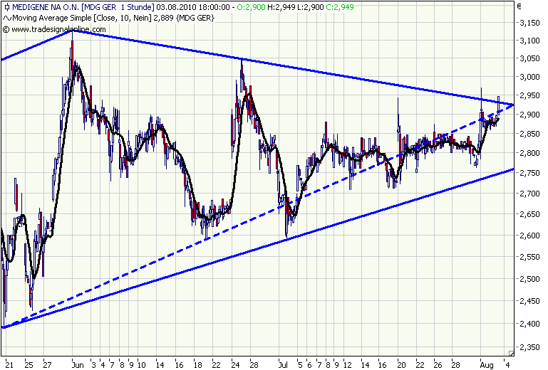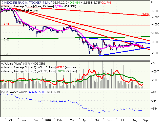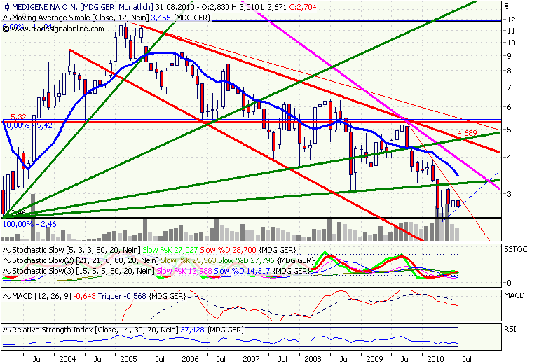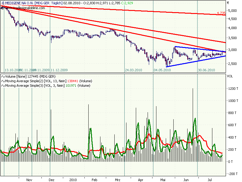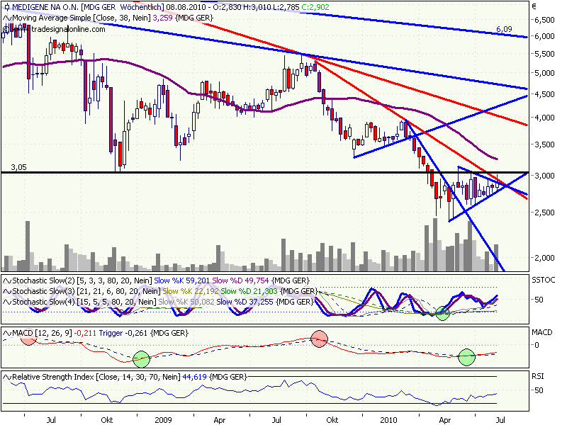 Dieser chart ist mit Wochenkerzen, die Erkenntnisse damit träger. Sollte Medigene den Ausbruch aus Downtrend und steigendem Dreick schaffen, dann dürfte es bis ca. 3,75 gehen. Da waren die Hochs von Januar und März.