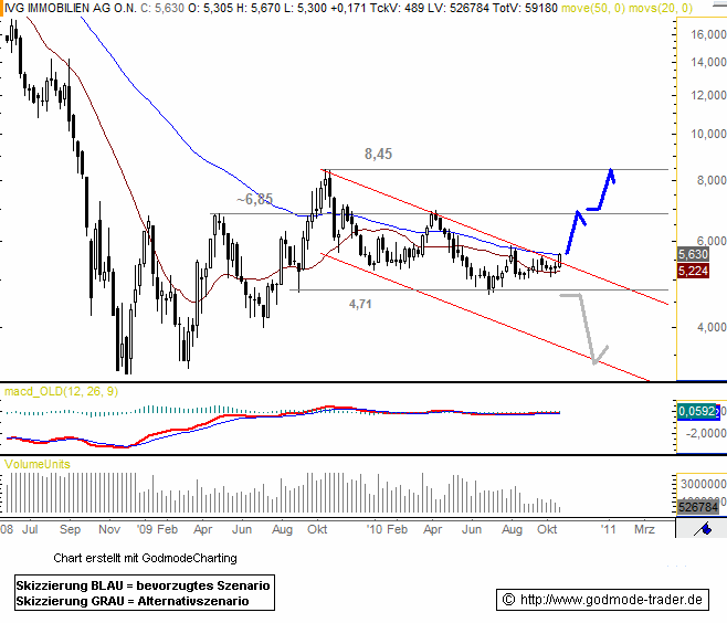 Charttechnischer Ausblick: Die Käufer in der IVG Immobilien Aktie haben es aktuell in der Hand, mit einem Ausbruch über 5,65 Euro für einen Richtungswechsel zu sorgen. Gelingt ein solches Kaufsignal, dürfte weiteres Kapital in die Aktie fließen und so Kursgewinne bis auf 6,85 Euro ermöglichen. Anschließend läge ein nächstes Ziel dann bei 8,45 Euro.