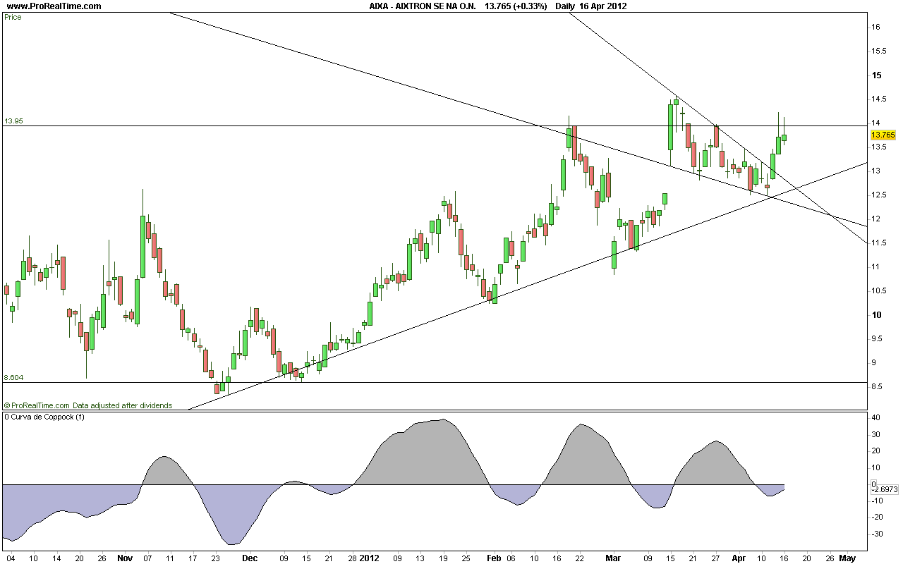 Kurz- und mittelfristig befindet sich Thyssen jedoch in einem Abwärtstrend. dabei ist die rote Linie eine ehemalige Keilutnerlinie, die im Moment noch deckelt, und die blaue Linie die relevante Abwärtslinie. Beide sollten im Soge eines positiven Umfelds keine allzugroßen Probleme darstellen, so dass zumindest ein Test von 20,57 drin ist, wenn die TL seit 2009 hält. Die candles zeigen eine Umkehrformation, coppock zeigt einen Boden an.