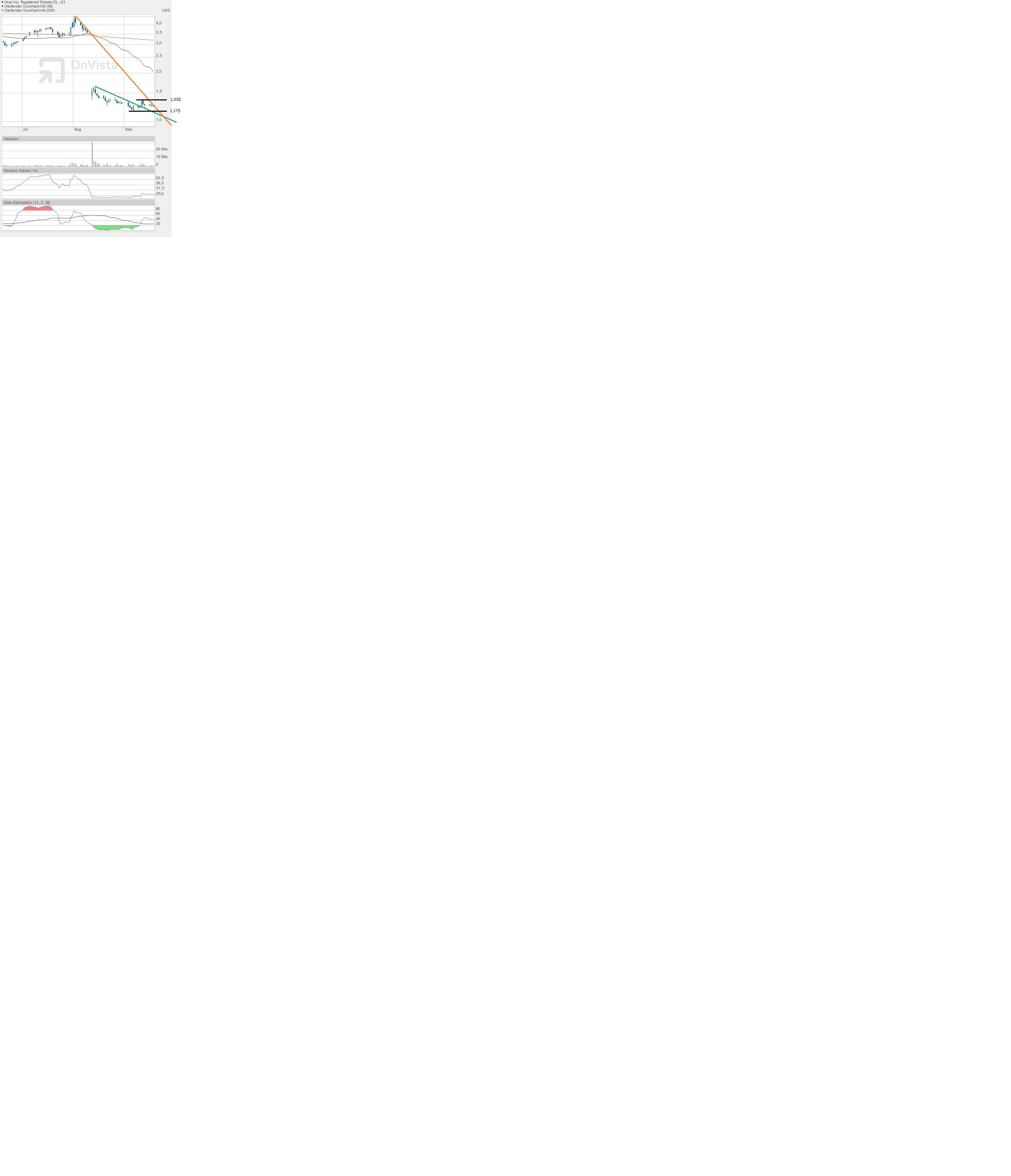 Da gestern, wie bereits am Montag, im Hoch die 1,28$ erreicht wurde, kann man nun auch nicht mehr behaupten, dass am Montag die orangene Abwärtstrendlinie getroffen wurde. Ganz genau konnte man die Linie aufgrund des langen Weges nicht einzeichnen. So sieht es aktuell so aus, dass gestern die Abwärtstrendlinie erreicht wurde. Heute wurde zudem 1,28$ noch nicht gesehen, sondern nur 1,26$. Das würde damit zahlenmäßig passen. Von der Nachrichtenlage her, könnte es auch passen, denn gegen 20Uhr meldet sich die FED zu Wort. Steigen daraufhin die Märkte, dann sehen wir den Ausbruch. Fallen die Märkte, dann haben wir mit 1,28$ einen brauchbaren Anhaltspunkt gefunden, denn die Aktie wird dann fallen, und die Trendlinie kann genau eingezeichnet werden. In circa 2 Stunden sollte man also mal reinschauen in die Börsenwelt. Es wird sich was bewegen. |