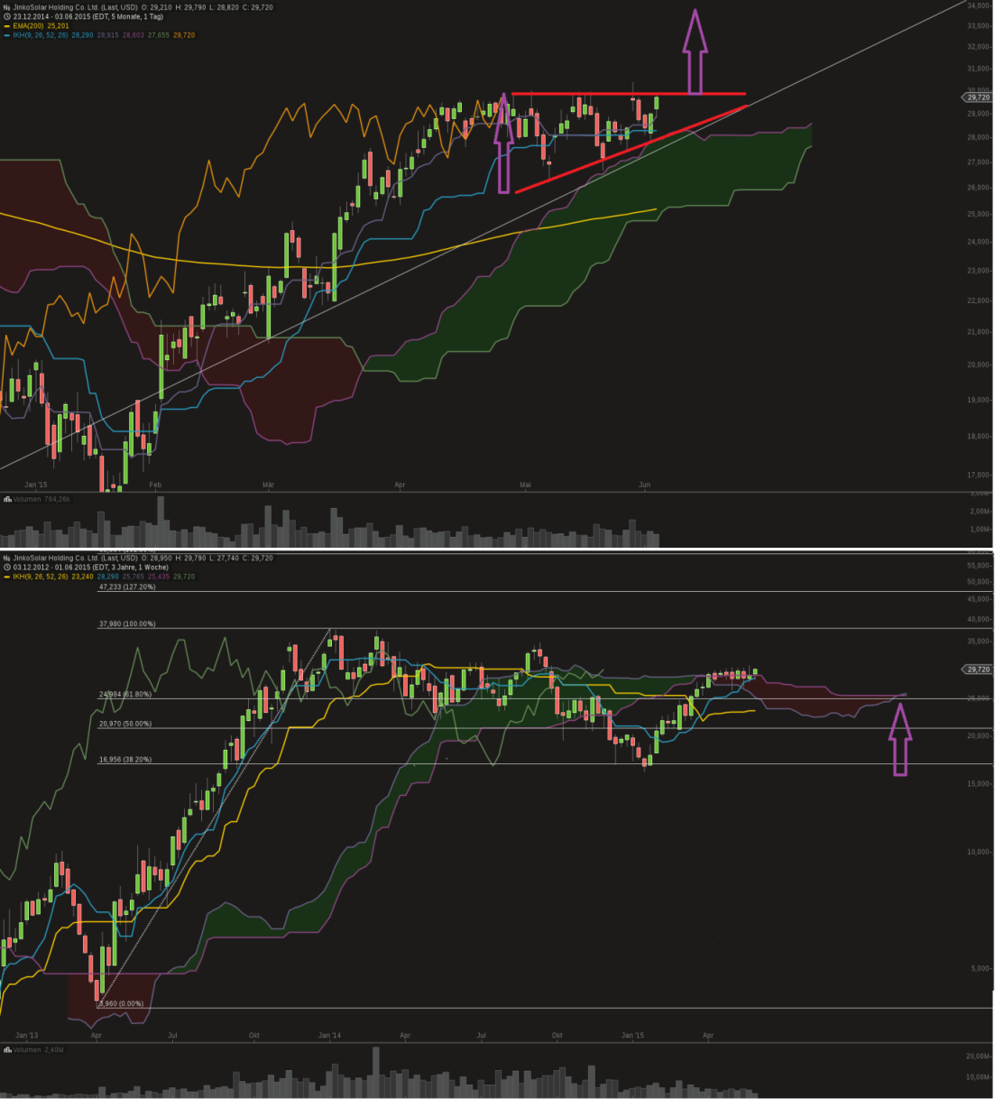 In den kommenden Handelstagen/Wochen wird sich zumindest mittelfristig Jinko für eine Richtung entscheiden müssen. Die Richtung steht noch nicht fest....aber was fest steht ist, dass wir im Bereich von 29USD nicht bleiben werden.