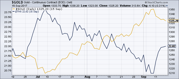 Interessanterweise korreliert der Zinschart der Zehnjährigen in der jüngeren Vergangenheit recht stark mit dem Goldpreis, der beigefügte Chart zeigt dies deutlich auf.