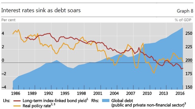 Die beigefügte Grafik illustriert die Entwicklung von Schulden und Zinsen weltweit. Die rote Linie zeigt die Renditen auf inflationsgeschützte Anleihen – also eine Approximation des realen Zinses. Die gelbe Linie trägt den inflationsbereinigten Leitzins der wichtigsten Industrieländer ab. Und die blaue Fläche ist die weltweite Schuldenlast im Verhältnis zum Bruttoinlandprodukt.