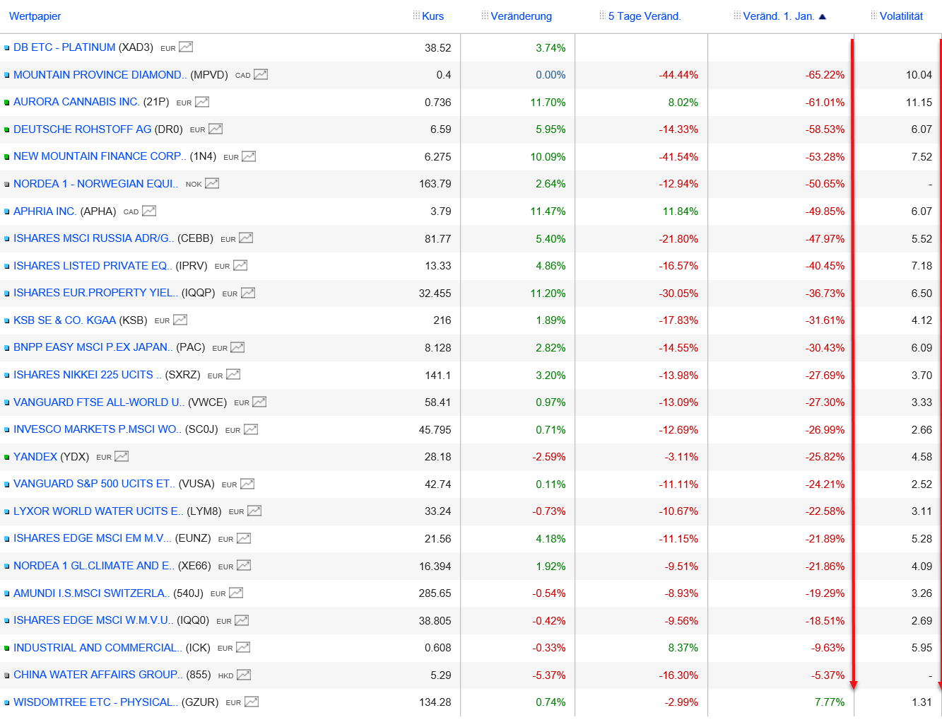 Prozentual gesehen ist erneut Aurora Cannabis der traurige Spitzenreiter mit rund -69%, gefolgt von Mountain Province Diamonds mit rund -58% und New Mountain Finance mit rund -42%. Mit rund -32% folgt RHI Magnesita, mit -29% die KSB und die Deutsche Rohstoff AG; weiter geht es mit -18,5% bei Aphria und sogar Poxel steht aktuell mit -13,5% im Minus. Der Rest liegt unter -6% (also auch mein China Water Affairs-Klumpen).