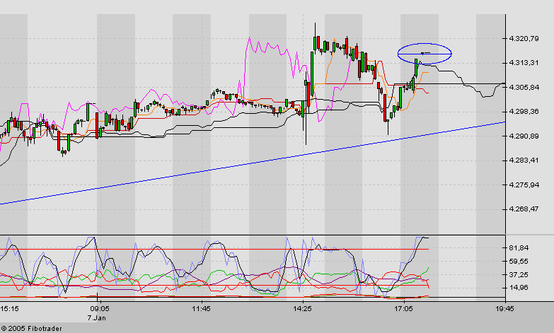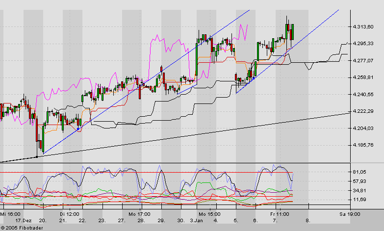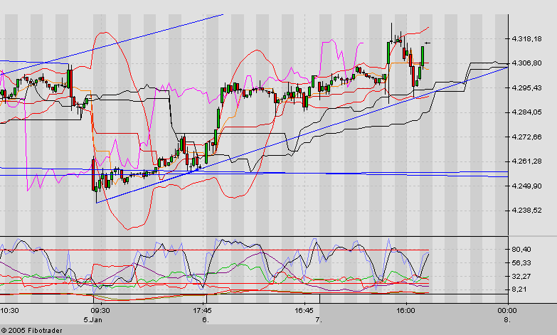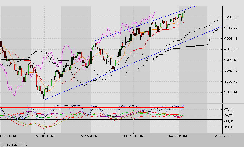 kurze meinung: was man schön sieht, dass der Trend (bis auf die unsichere phase am 5.01.05)dauernd positiv ist. Fast wäre er da nach unten durchgeknallt. Ich würde mit weiterem short erst agieren wenn die Wolke signifikant durchbrochen wird. Vor allem die, die nicht andauernd vor´m Rechner sitzen können (wie ich)