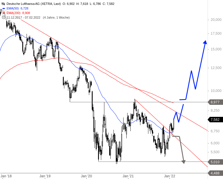 Kurzfristig weiter im Rallymodus Die Lufthansa-Aktie kann kurzfristig noch bis 8,98 EUR ansteigen. Ein großes Kaufsignal ergäbe sich aber erst mit einem Ausbruch darüber. Ein rechnerisches Ziel läge dann bei 16,49 EUR.