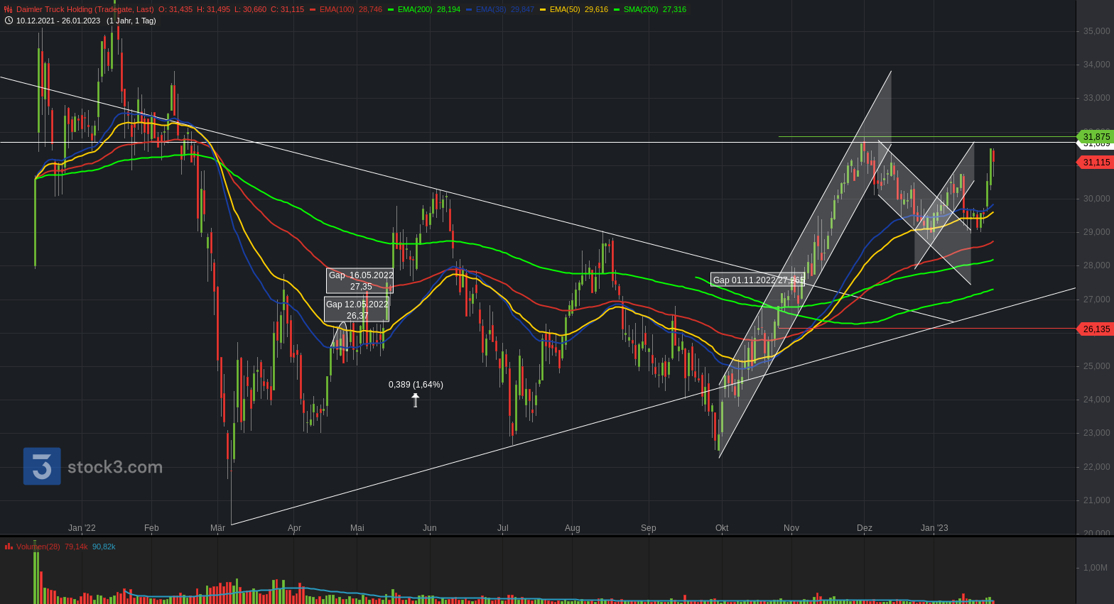 In der Regel wird auch die Höhe der Dividende vorgeschlagen. Alles in allem steht Daimler Truck gut da. Am Wörther Standwerk sind sogar Samstage für die Produktion eingeplant. Der Langfristige Aufwärtstrend ist intakt und der kurzfristige Abwärtskanal wurde heute nach oben durchstoßen. Für nächste Woche, sofern das Börsenumfeld jetzt nicht gerade zu krass negativ ist, sollte aus meiner Sicht der Kursverlauf positiv sein. Nächste Woche am Freitag wissen wir mehr.