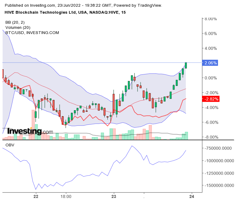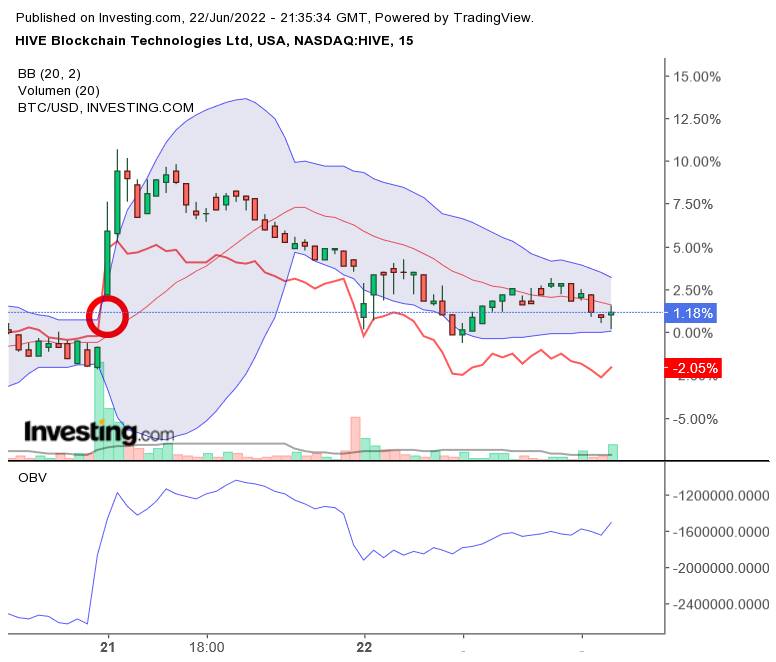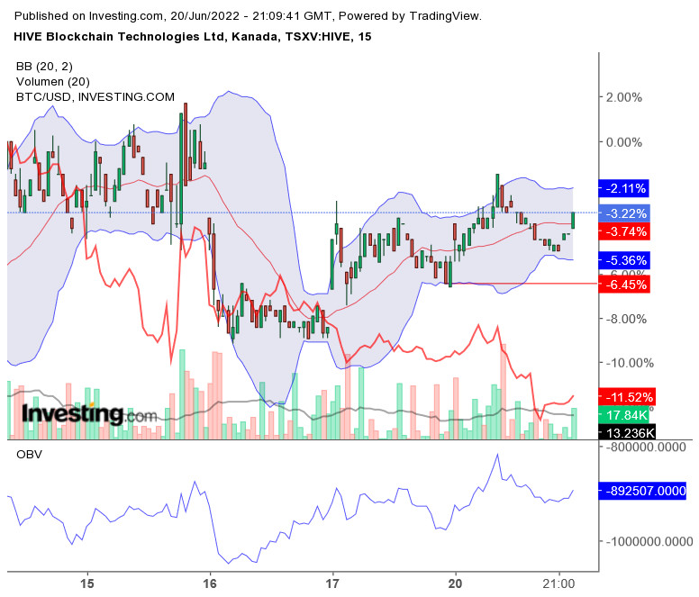 Hive zeigt relative Stärke zu Bitcoin (rote Linie), könnte ein interessantes Investment werden.