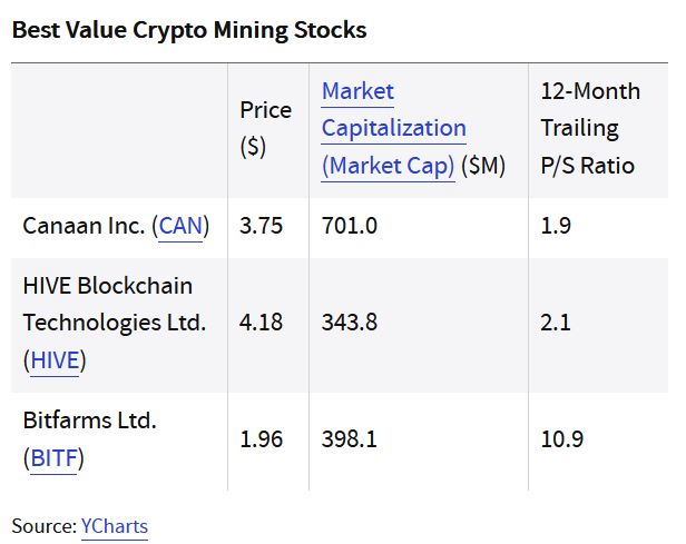 These are the crypto mining stocks with the lowest 12-month trailing price-to-sales (P/S) ratio. For companies in the early stages of development or industries suffering from major shocks, this can be substituted as a rough measure of a business’s value. A business with higher sales eventually could produce more profit when it achieves (or returns to) profitability. The P/S ratio shows how much you’re paying for the stock for each dollar of sales generated.