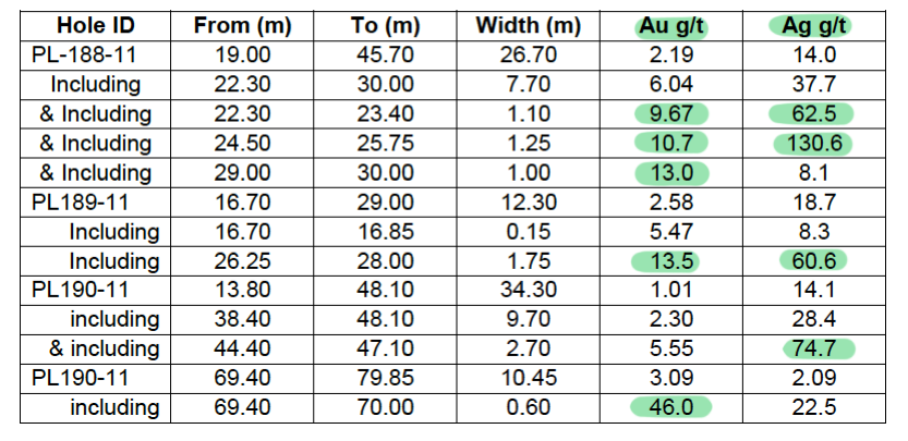The second drill hole, PL-189, cut a near surface stockwork zone and produced an intersection of 12.3m @ 2.58 g/t gold and 18.7 g/t silver from 16.7m down-hole depth, including a high-grade vein intersection of 1.75m @ 13.5 g/t gold and 60.6 g/t silver from 26.25m. The third drill hole, PL-190, intersected a 48m down-hole thickness of hydrothermal breccia mineralisation from 1.9m. Significant intersections include 34.3m of 1.01 g/t gold and 14.1 g/t silver from 13.8m down-hole depth, including