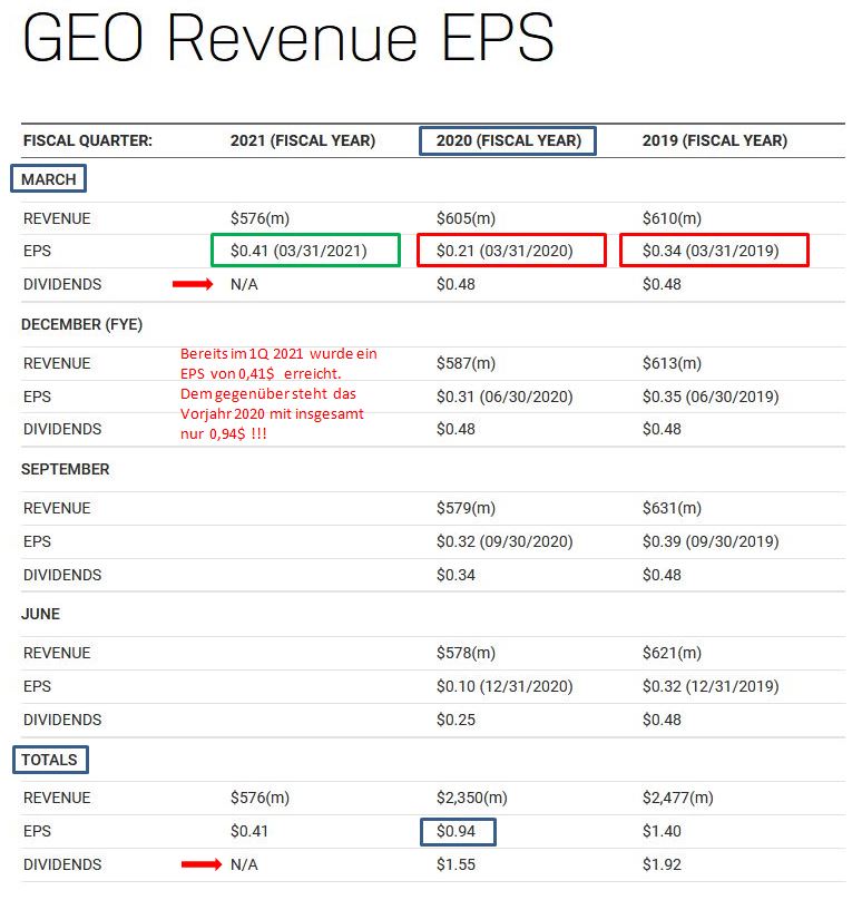 Was ist GEO wert? 1. Gewinn: Wir wussten bereits, dass GEO spottbillig ist und nur zu einem 5,8-fachen Gewinn im Jahr 2021 gehandelt wird. Unterdessen wird das durchschnittliche Unternehmen im Russell 1000 Index bei 19,5x gehandelt. Wenden Sie dieses 19,5-fache auf den Gewinn von GEO von 1,20 USD pro Aktie an und Sie erhalten einen Aktienkurs von 23,40 USD. 2. Immobilien-/Ersatzkosten: Jetzt wissen wir auch, dass die Wiederbeschaffungskosten von GEOs Einrichtungen abzüglich Verbindlichkeiten ein absolutes Minimum von 50,26 USD pro Aktie betragen.