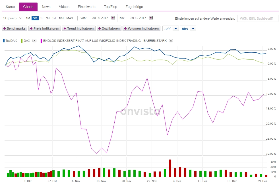 Jetzt noch eine Anmerkung: Mit dem Dax sich zu vergleichen ist eher schwach, da du nicht in die grössten Konzerne investierst. Dein Vergleichsindex ist eher der SDAX oder noch gemeiner der TecDax, beide haben sich deutlich besser als der DAX entwickelt. In den letzten 6 Monaten war das Wikifolio schwächer als alle 3 Indizes.
