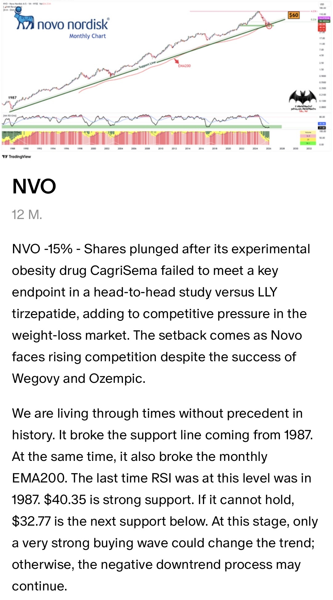 Immer wenn du denkst schlimmer kanns nicht mehr kommen, haut Novo noch einen raus. Ich hab hier so langsam echtes Paypal-Feeling. Jetzt werden sicher noch jede Menge Kleinanleger die weiße Flagge hissen und genervt das Handtuch werfen und die Institutionellen wollen sich mit so einem Wert, der wirklich nur eine Richtung kennt auch nicht mehr die Performance versauen. Jetzt könnte man ja meinen, nur so unverbesserlich bekloppte wie ich drücken hier noch den Kaufbutton (habe heute unter 34 EUR noch ein paar Stücke eingesammelt).  Aber jedem Verkäufer steht auch immer ein Käufer gegenüber. Ich weiß natürlich auch nicht, ob Novos Reise gen Süden sich so langsam dem Ende nähert und wäre auch nicht überrascht, wenn es auch nochmal unter die Marke von 30 EUR fällt. Der negative Trend ist jedenfalls voll intakt und jeder Kauf ist aktuell ein Griff ins fallende Messer. Ich bleibe jedenfalls investiert und wenn es dann unter die 30 EUR fällt weil die Nachricht kommt, dass sich der CEO von Novo den Kaffee über die Hose verschüttet hat, kauf ich auch nochmal nach ;-)