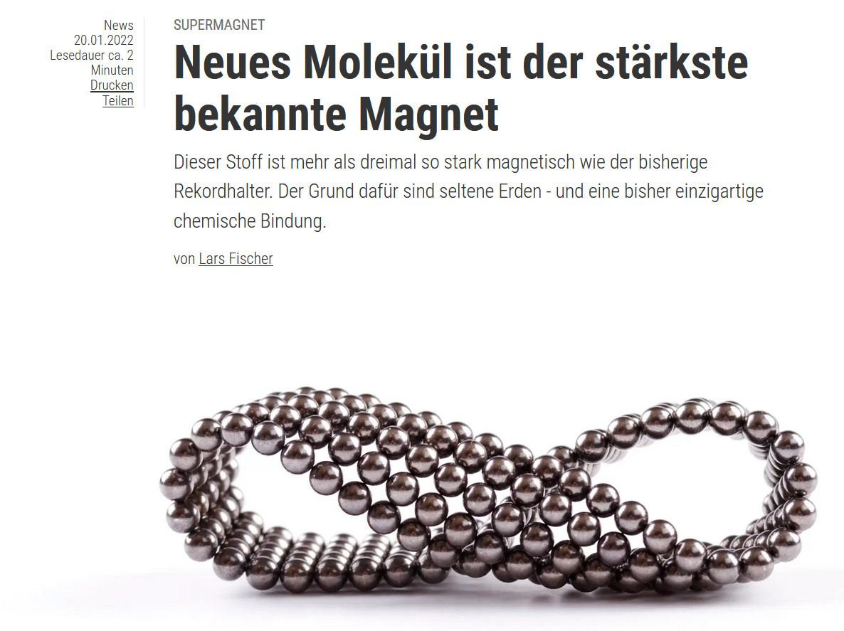 Das ist nicht nur mehr als das Dreifache des bisherigen Rekords von 7,9 Tesla, sondern auch fast das Doppelte der maximal möglichen Feldstärke in gängigen Messapparaturen, so dass das Team bisher keinen exakten Wert nennen kann. Solche superstarken molekularen Magnete sind einerseits interessant für Speichermedien, die auf magnetisierbaren Stoffen basieren. Andererseits ist laut dem Team aber auch vorstellbar, aus diesen Molekülen große Magnete für andere technische Anwendungen zusammenzusetzen. Deren Magnetfeldstärke würde die heutigen »Supermagnete« auf Basis von neodymhaltigen Legierungen noch einmal deutlich übertreffen. https://www.spektrum.de/news/...utm_source=pocket-newtab-global-de-DE |