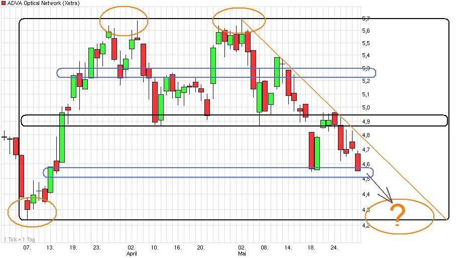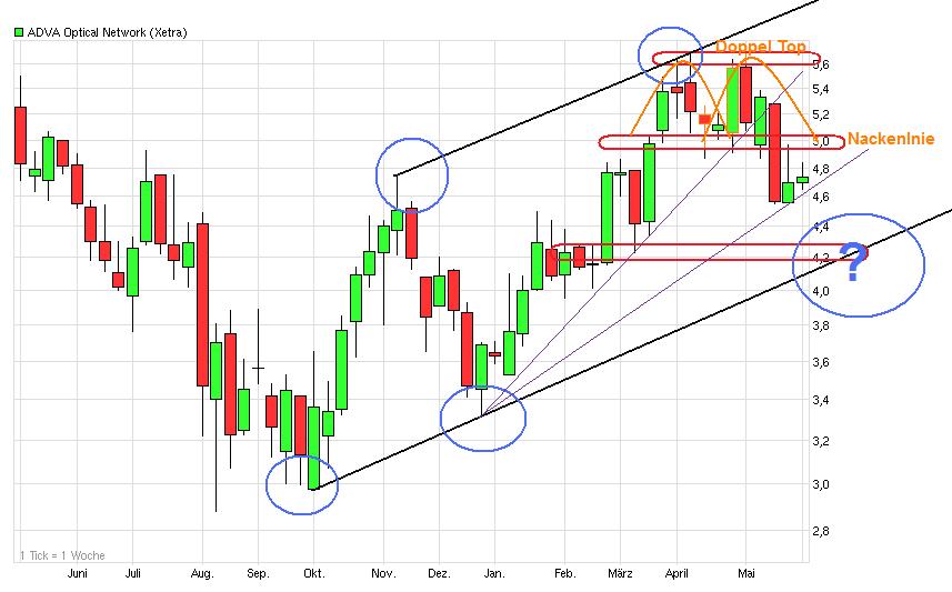 Trendlinienbruch und Doppelhoch sind derzeit die kräftigsten Argumente der Bären, mit denen nun auch die Adva Aktie nach einer langen Zeit relativer Stärke mit entsprechenden Verkaufssignalen daherkommt. Bestätigt wurden diese zuletzt durch den klassischen Pullback an das Ausbruchsniveau bei 4,87 – 4,74 Euro. In diesem nun zum Widerstand gewordenen Bereich prallten die Kurse letzte Woche nach unten hin ab und sollten nun ihre Abwärtsbewegung in Richtung 4,23 Euro oder gar 3,65 Euro weiter fortsetzen. Erst ein schneller Kursanstieg über 5,05 Euro könnte dies verhindern.