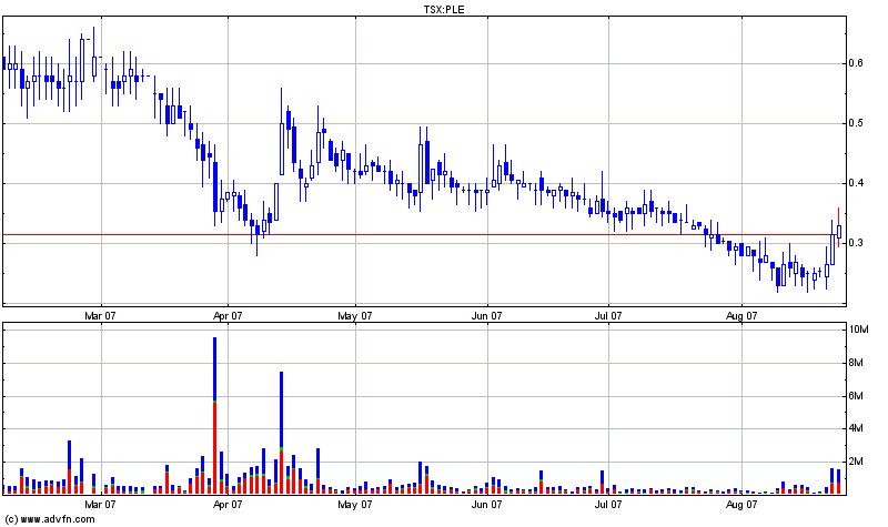 QUEBEC CITY, QUEBEC -- (MARKET WIRE) -- 06/28/07 -- Plexmar Resources Inc., (TSX VENTURE:PLE), is pleased to report recent exploration activities from the Bolsa del Diablo project located in Northern Peru. Sampling of artisanal workings (veins and rock selvages) has been implemented in the month of April in coordination and in agreement with local artisanal miners. All the samples included in this press release were taken from the Angolos concession from mid April to mid May. A total of 31 samples were taken. Results for assays above 1g/t are displayed in the tables below. The samples are grouped according to their geographic location (see appended maps for sample location). The first batch is located in the Angolos Norte Zone. The Angolos Norte Zone consists of a cluster of gold enriched vein and rock samples. It is mostly located in the northern part of the Angolos concession. At the present this zone is defined by samples scattered over an area of 1000m by 500m. However, it is suspected from this sampling that the anomalous area may increase in size. -------------------------------------------------- Angolos Norte Zone -------------------------------------------------- Au (g/t) Ag (g/t) Sample type -------------------------------------------------- 1 PBD-1022-VN 8.6 0.8 Transversal channel 40cm -------------------------------------------------- 2 PBD-1023-VN 1.8 1.0 Transversal channel 30cm -------------------------------------------------- 3 PBD-1023A-VN 3.8 10.8 Transversal channel 40cm -------------------------------------------------- 4 PBD-1025-VN 1.2 13.3 Transversal channel 10cm -------------------------------------------------- 5 PBD-1026-VN 11.4 25.4 Transversal channel 10cm -------------------------------------------------- 6 PBD-1027-VN 65.5 143.0 Selected sample -------------------------------------------------- 7 PBD-1025-RX 2.8 2.3 Chip sample 1m x 2m -------------------------------------------------- 8 PBD-1026-RX 1.4 2.0 Chip sample 1m x 2m -------------------------------------------------- 9 PBD-1027-RX 13.7 24.9 Chip sample 1m x 2m -------------------------------------------------- 10 PBD-1029-VN 3.6 15.1 Transversal channel 15cm -------------------------------------------------- 11 PPBD-1029A-V 1.9 13.1 Composite sample -------------------------------------------------- 12 PBD-1057-VN 54.9 19.3 Transversal channel 15cm -------------------------------------------------- 13 PBD-1044-VN 4.4 8.2 Transversal channel 20cm -------------------------------------------------- 14 PBD-1045-VN 12.4 19.9 Transversal channel 15cm -------------------------------------------------- 15 PBD-1046-VN 91.4 15.8 Transversal channel 20cm -------------------------------------------------- 16 PBD-1044-CJ 54.5 23.5 Transversal channel 20cm -------------------------------------------------- 17 PBD-1045-CJ 1.2 4.8 Transversal channel 15cm -------------------------------------------------- 18 PBD-1046-CJ 2.5 2.7 Transversal channel 30cm -------------------------------------------------- 19 PBD-1047-VN 13.5 9.3 Transversal channel 10cm -------------------------------------------------- 20 PBD-1054-VN 24.7 2.9 Transversal channel 20cm -------------------------------------------------- 21 PBD-1054A-VN 1.5 4.4 Transversal channel 20cm -------------------------------------------------- 22 PBD-1054-CJ 2.0 0.6 Transversal channel 100cm -------------------------------------------------- More specifically, sample 1 was taken along the eastern edge of the Angolos Norte Zone from a NE trending vein. Samples 2 and 3 are interpreted to be taken from tensional veins located 40m south of a first order structure, the Angolos Norte vein. Samples 4, 5, and 6 were taken from new artisanal tunnel developments extending over 6m. Sample 7, 8, 9 were taken in the selvages of the same-number vein sample. All these samples are located 250m north of the Angolos Norte vein. Samples 10 and 11 are taken from the NE part of the Angolos Norte zone along NE trending veins. Sample 11 is a composite sample taken from material extracted from the vein (sample 10). Sample 12 was taken approximately 40m north of samples 4 to 9. Samples 13 to 15 were taken from an E-W trending vein extending over 30m of strike length. Samples 16 to 18 represent samples taken from selvages for same- number vein assay. Sample 19 was taken from a parallel vein located 10m south of the previous one. Samples 20 to 22 were taken from a NNE trending vein. Sample location is 160m east of the previous veins. Sample 22 is a 1m channel sample taken from the footwall of the same-number vein sample. A second cluster of samples coming from the southern part of the Angolos concession is displayed in the table below: -------------------------------------------------- Southern part of Angolos concession -------------------------------------------------- Au (g/t) Ag (g/t) Sample type -------------------------------------------------- 23 PBD-1024-VN 6.1 21.5 Transversal channel 40cm -------------------------------------------------- 24 PBD-1048-VN 28.7 92.9 Transversal channel 40cm -------------------------------------------------- 25 PBD-1060-VN 3.5 15.1 Transversal channel 40cm -------------------------------------------------- 26 PBD-1049-VN 6.0 3.2 Transversal channel 20cm -------------------------------------------------- 27 PBD-1071-RX 3.6 11.7 Chip sample 2m radius -------------------------------------------------- 28 PBD-1072-VN 1.9 16.0 Transversal channel 10cm -------------------------------------------------- 29 PBD-1072A-VN 2.2 13.5 Transversal channel 10cm -------------------------------------------------- Samples 23 to 25 come from a small shaft and are spread over 12m of depth. Sample 26 is probably located on the same NE vein, 65m to the NE of the previous samples. Sample 27 is located 225m to the NNE of the previous sample. It comes from an argilized stockwork. Sample 28 and 29 are located on strike with the previous vein samples, 225m to the NE. "Thes