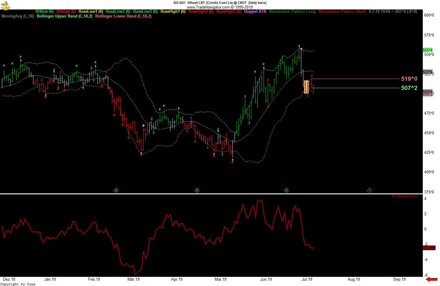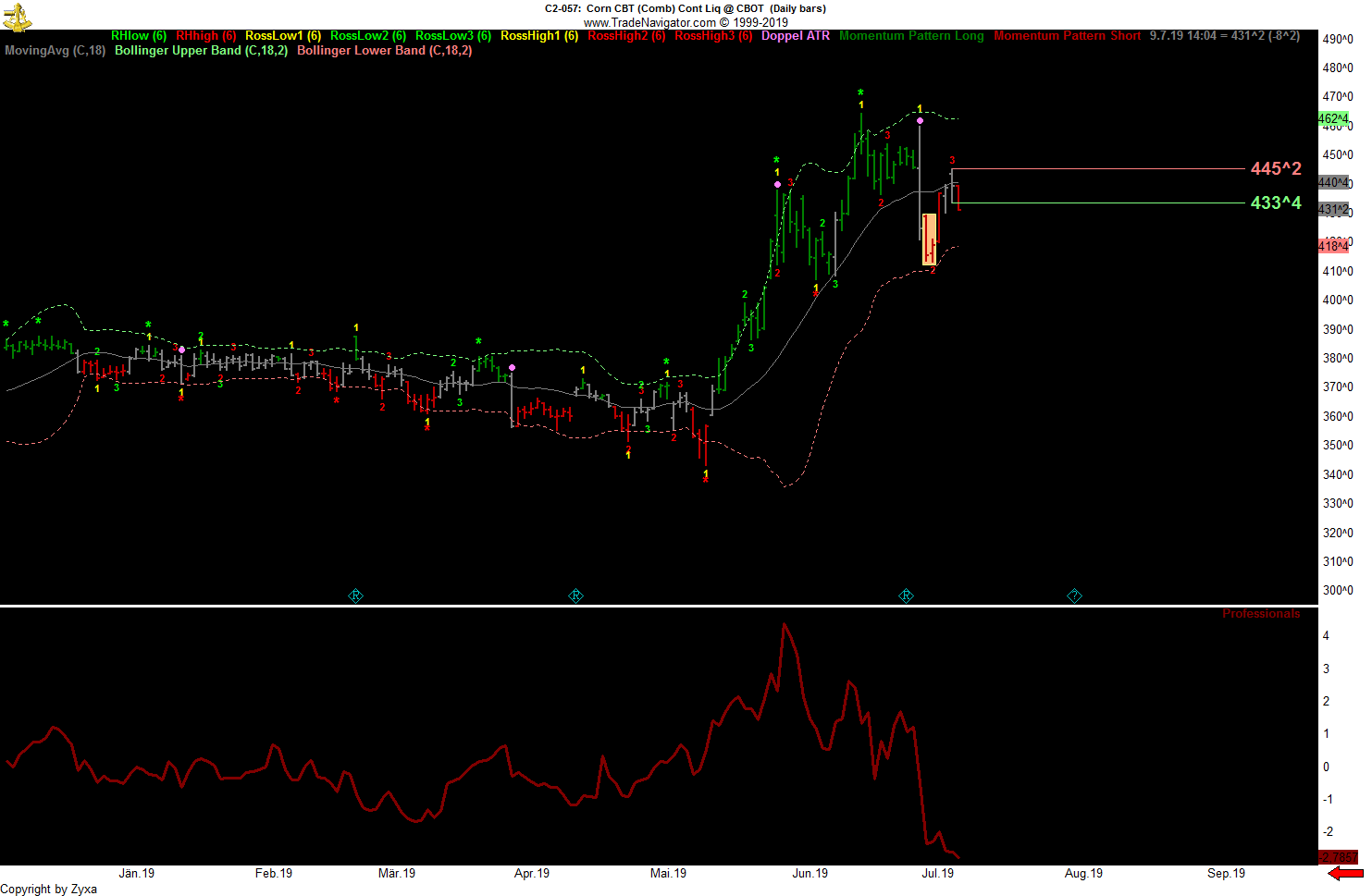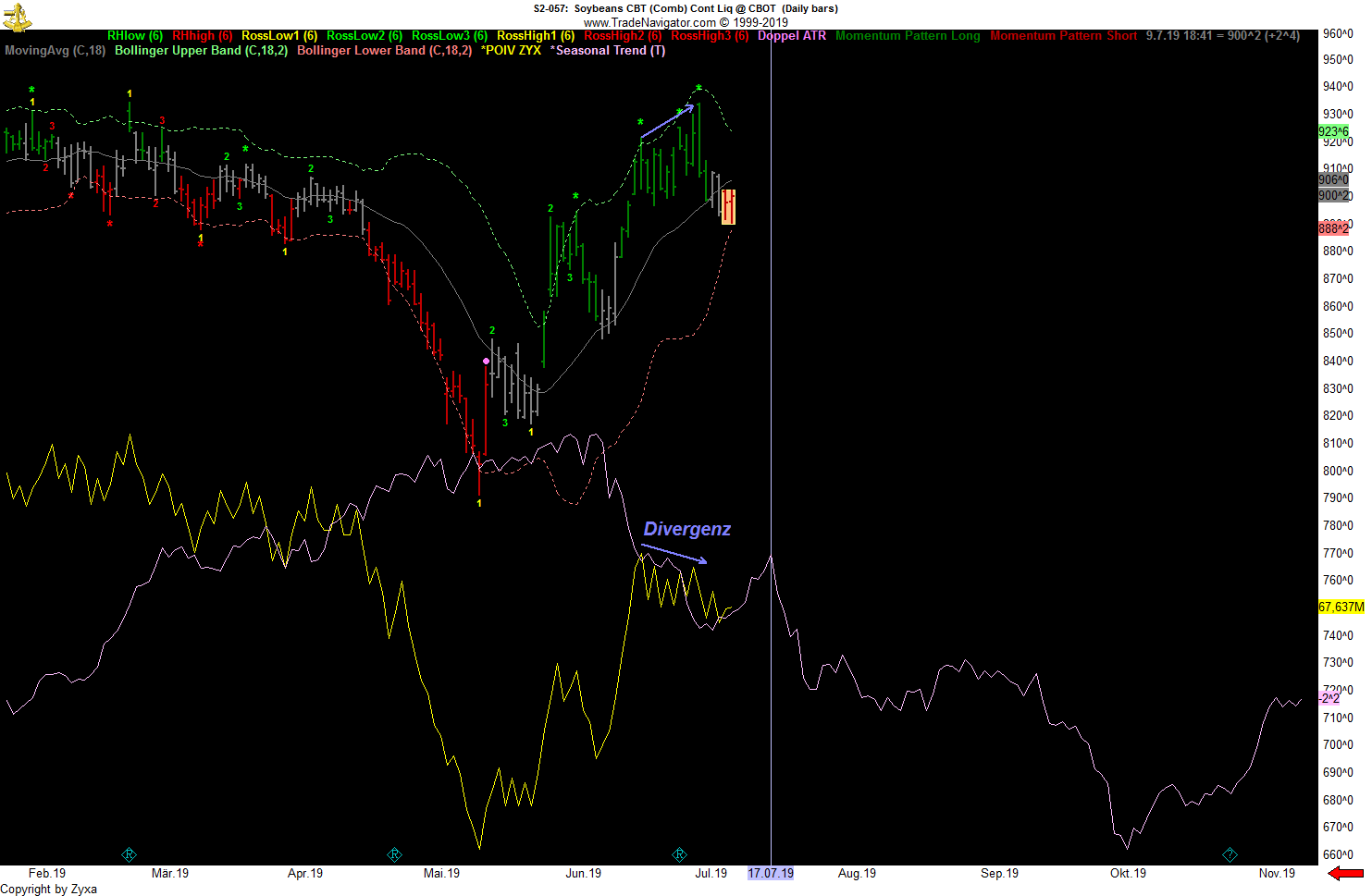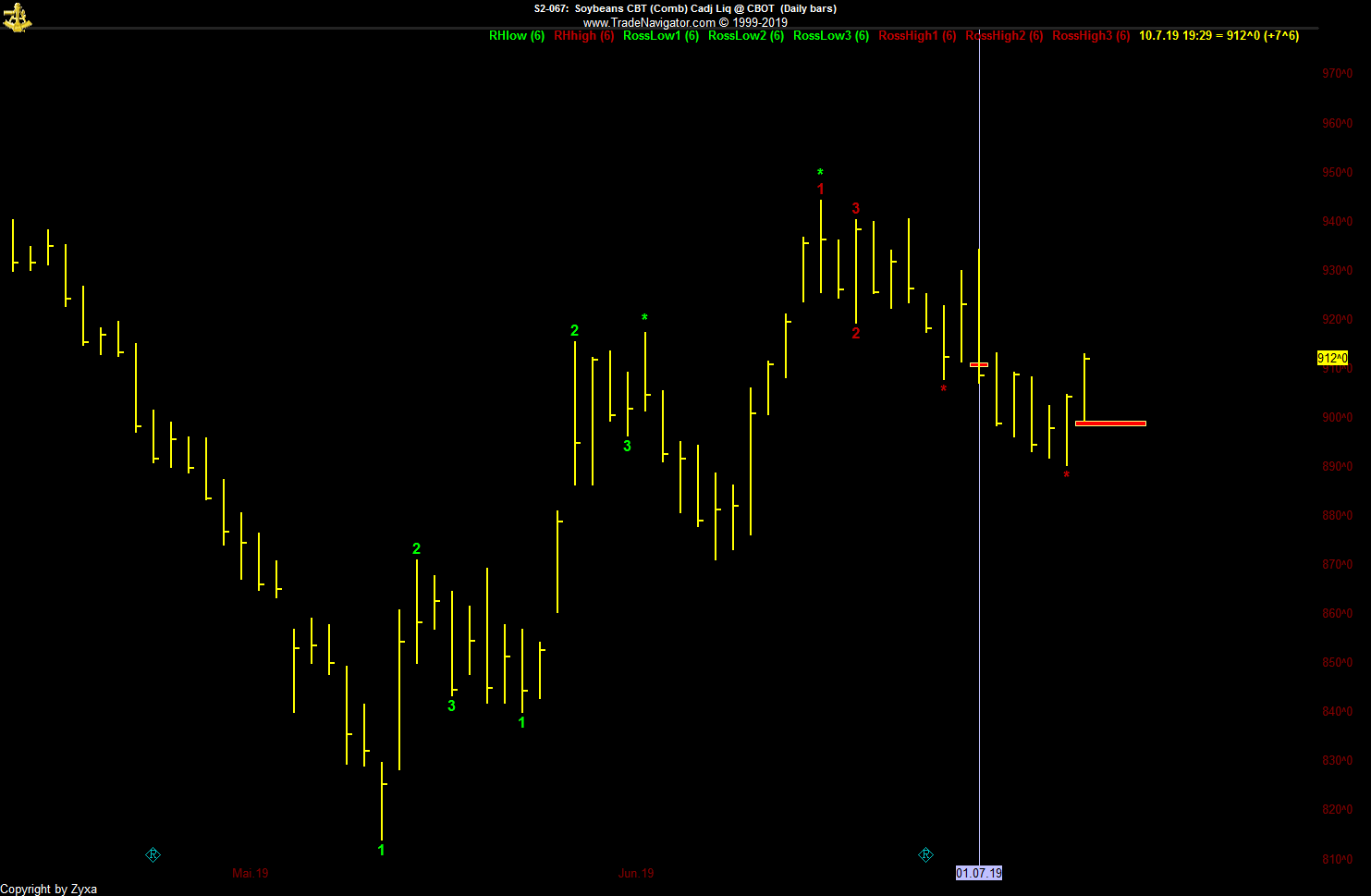 Alternativ kommt dann sein Trick des Traders ins Spiel. Im Beispiel Sojabohne haben wir laut Cot Report ein Short Signal. Am 27. Juni entstand ein Ross Hook....Mit TdT wäre Posi eins am 1. Juli passiert, und zwar am Tief des Vortages.