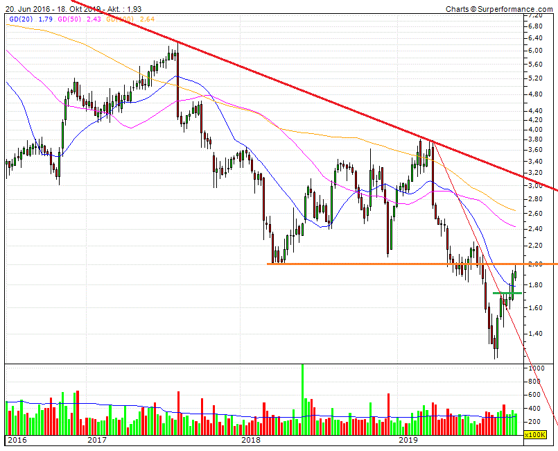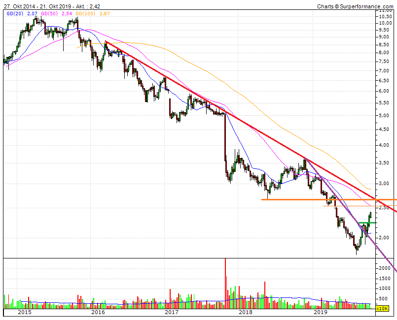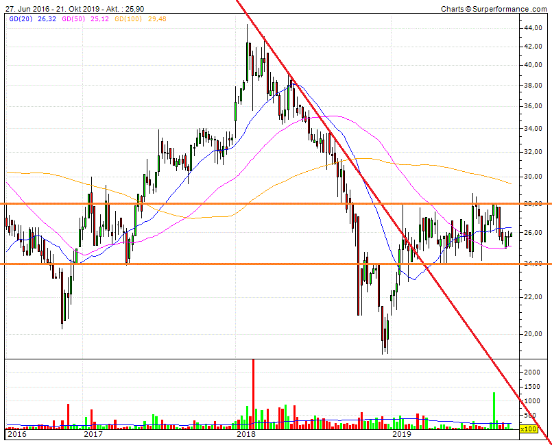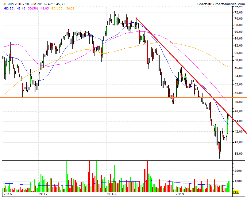 Die Aktie hat bei 45,8 € ihren primären Downtrend erreicht. Es könnte also theoretisch sein, dass sie nun wieder abtaucht, obwohl ich sie für fundamental sehr gut aufgestellt halte. Andererseits könnte der Ausblick aufs Geschäftsjahr 2019/20, der wohl Mitte November verkündet wird, etwas enttäuschen. Denn ich gehe davon aus, dass die hohen Konsenserwartungen des Marktes wohl in dem konjunkturellem Umfeld etwas zu hoch sind. Was der Markt dann draus macht, bleibt abzuwarten, denn man ist mittelfristig sehr gut positioniert und mit KGV von etwa 18 auch nicht teuer. Aber ich warte wie gesagt erstmal ab. Sollte der Downtrend durchbrochen werden, hätte man zumindest erstmal Platz bis zum 2016er Tief bei 49 €. Vielleicht geht die Aktie ja dann auch erstmal in eine Seitwärtsphase zwischen grob 40 und 50 € über. Auf Sicht von 3 Jahren sollten hier aber durchaus auch wieder die Hochs bei 72 € machbar sein.